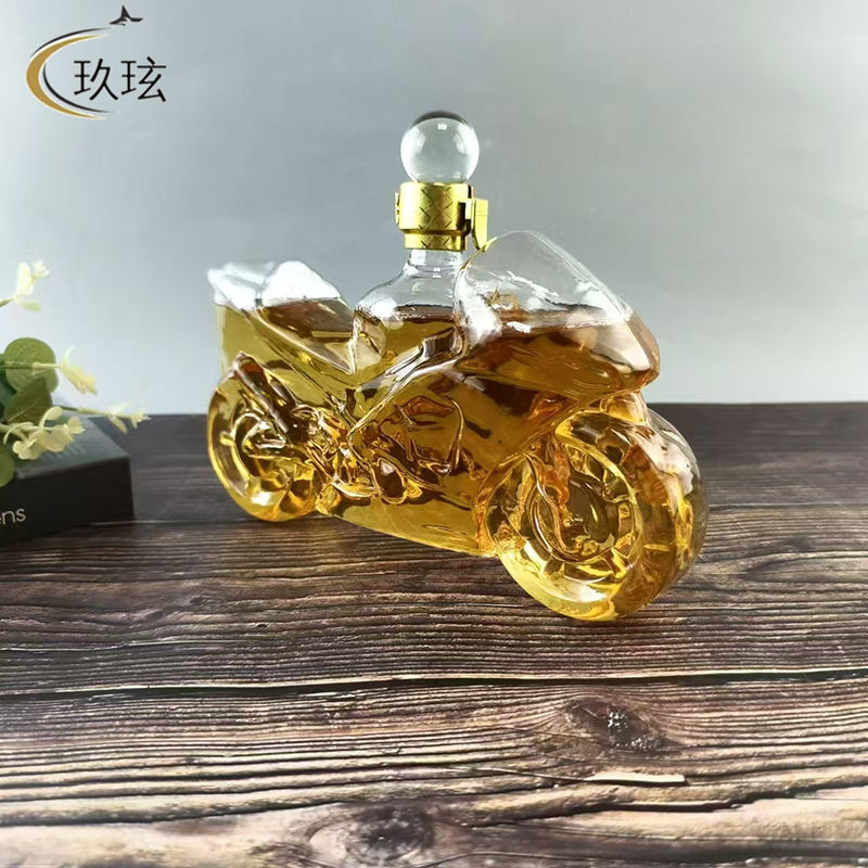 海外貿易で人気の工場卸売オートバイ型ワインボトル高ホウケイ酸ガラス製空きワインボトル特殊形状デカンタ