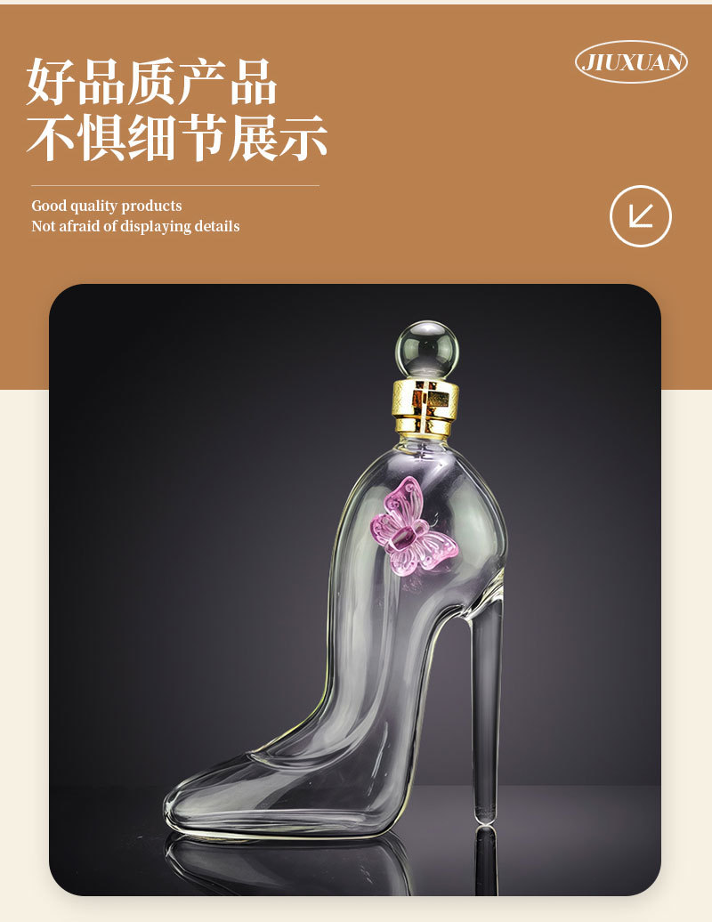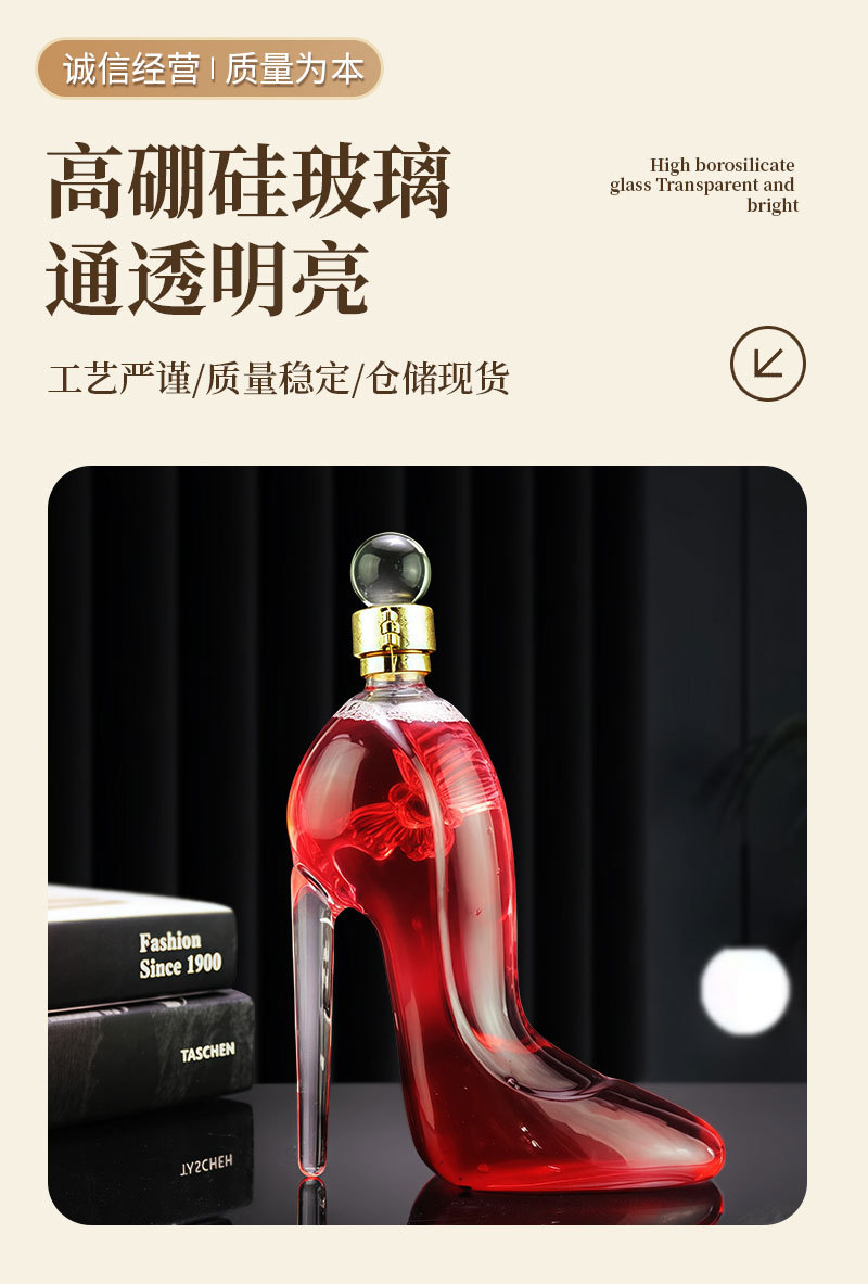 高級ハイヒール型ワインボトル工芸品、クリエイティブな高硼珪酸ガラス製デカンタ、ウイスキー用空ボトル卸売