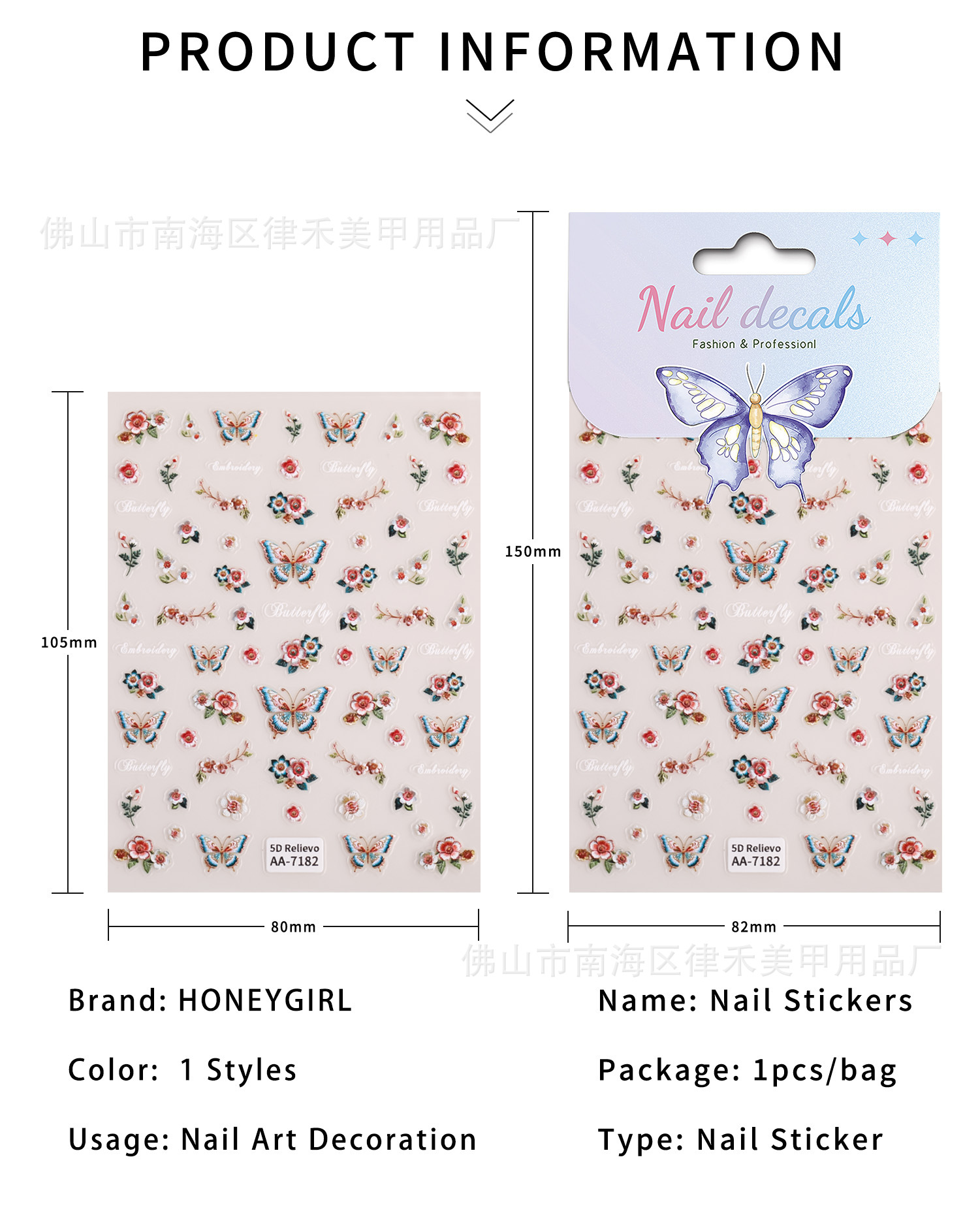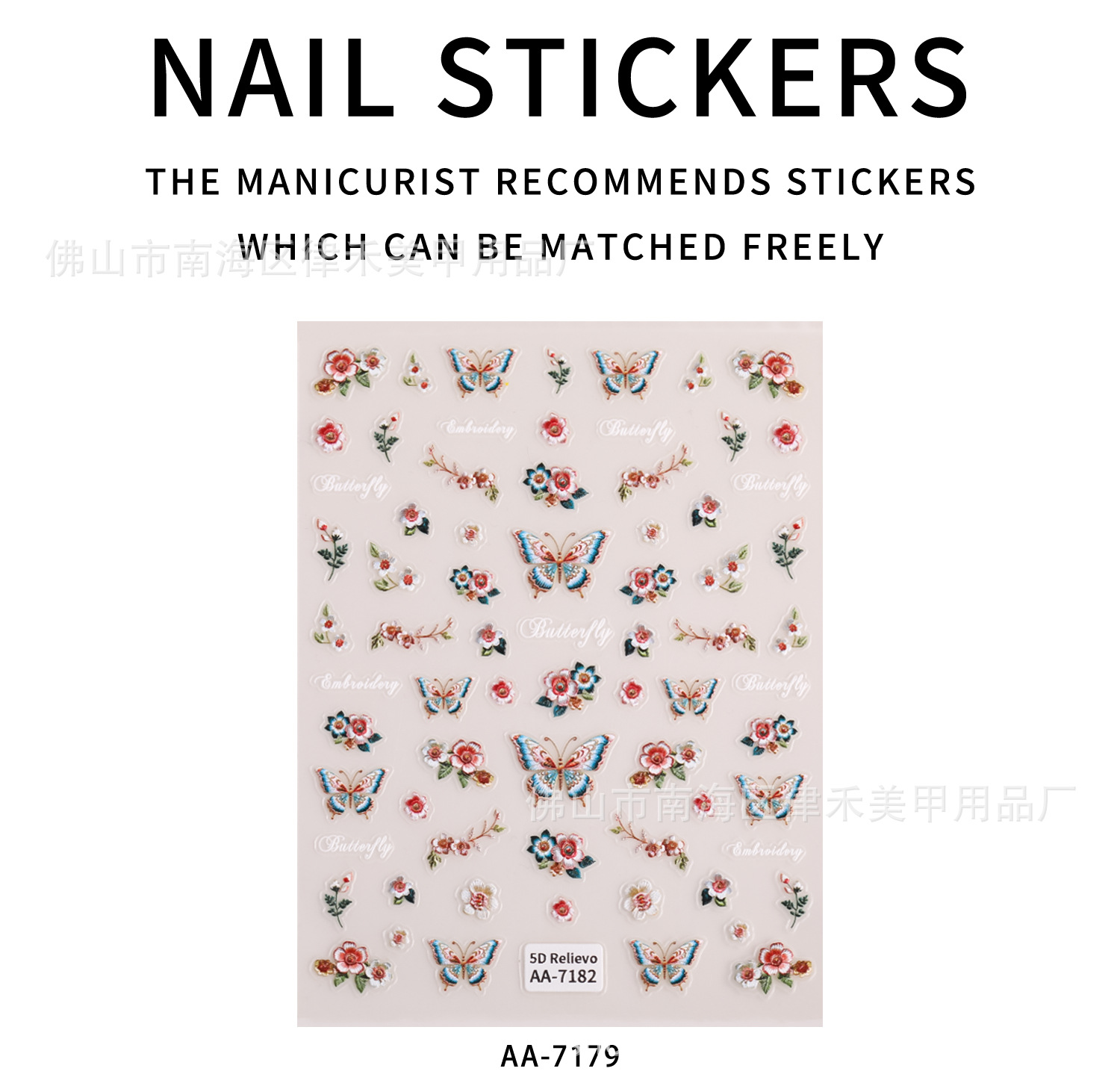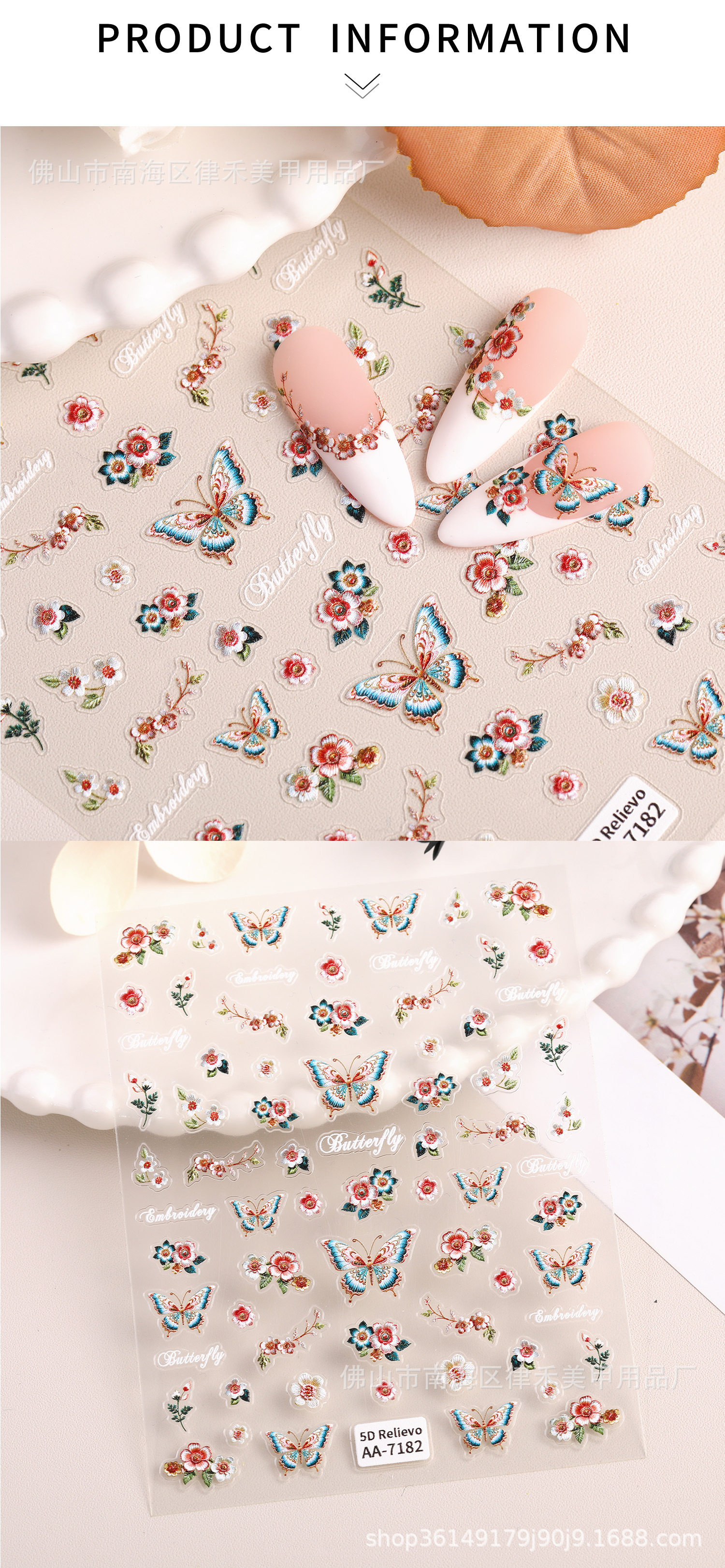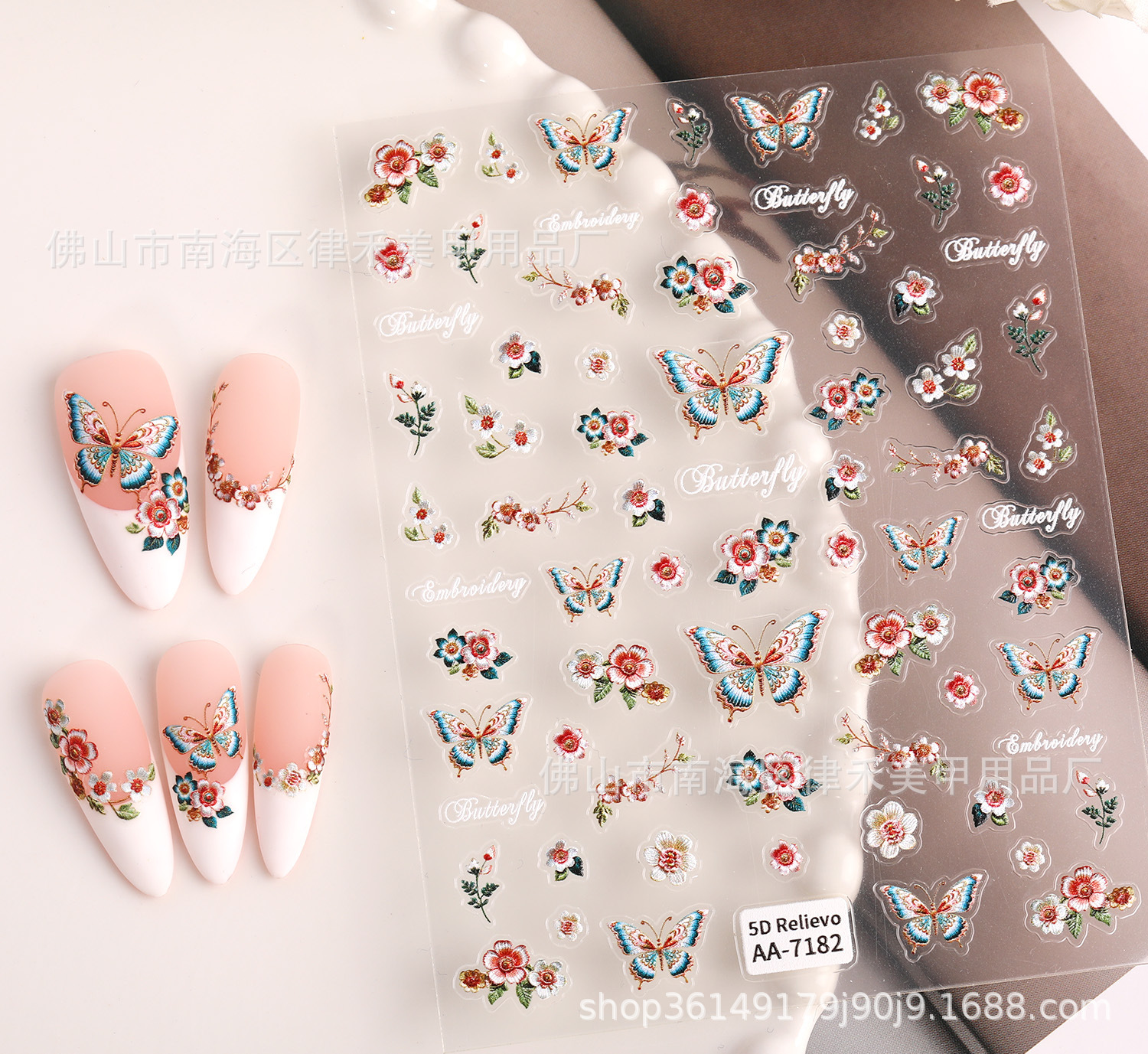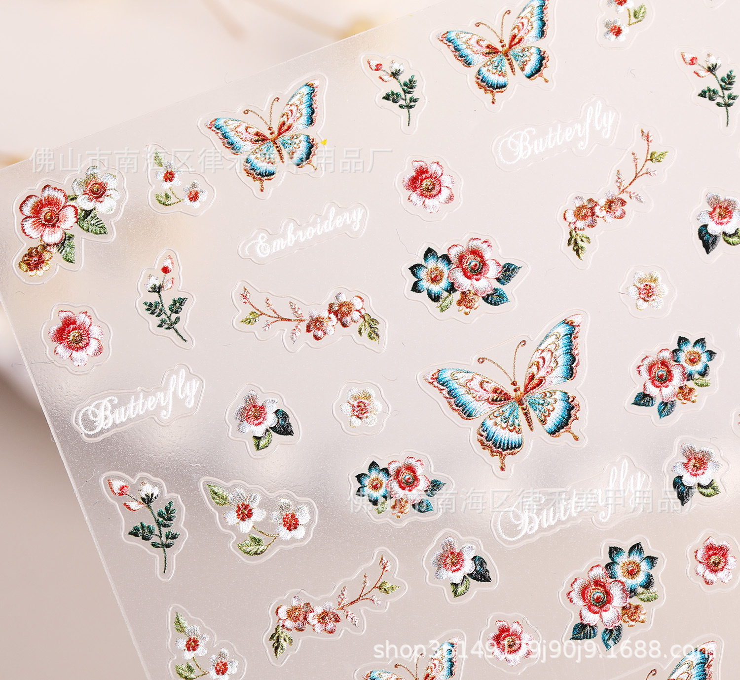 国风刺绣蝴蝶指甲贴纸5D浮雕中式花朵蝴蝶美甲贴纸饰品 原创AA款