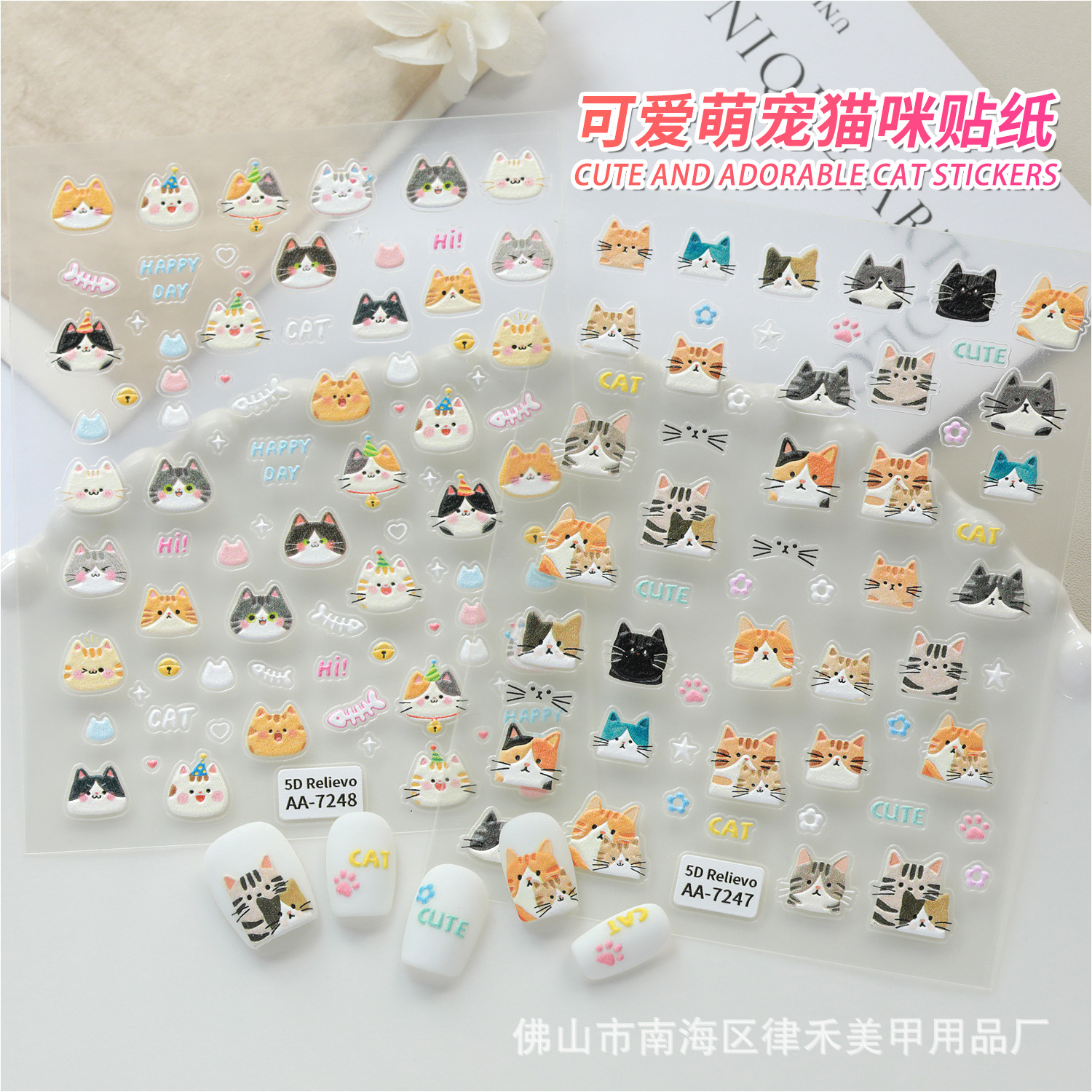日系卡通可爱呆萌小猫美甲贴纸浮雕超萌小猫头花朵猫爪指甲贴批发