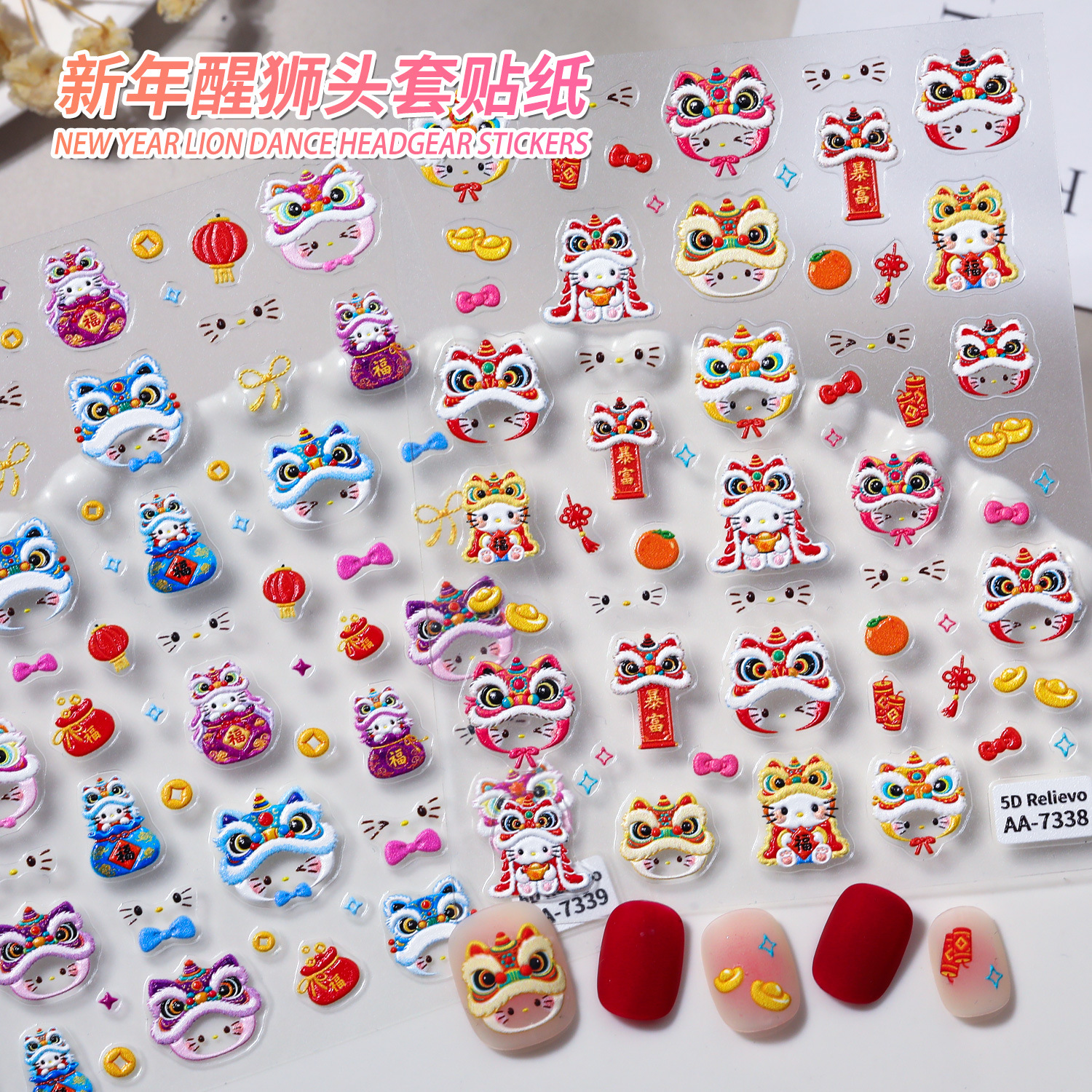 2026年新款新年醒狮可爱小猫头套美甲贴纸浮雕福袋金币立体指甲贴