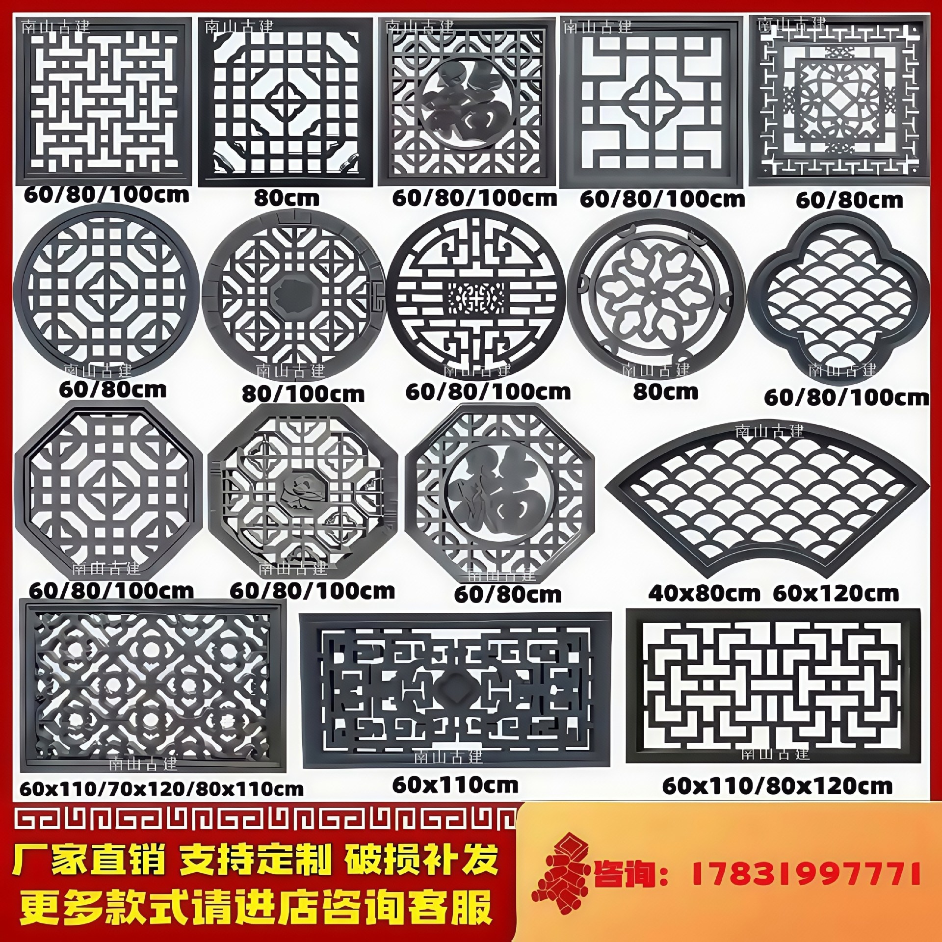 セメント窓格子、中空レンガ彫刻、長方形の窓、丸い格子窓、中国風の中庭、アンティークの壁の装飾