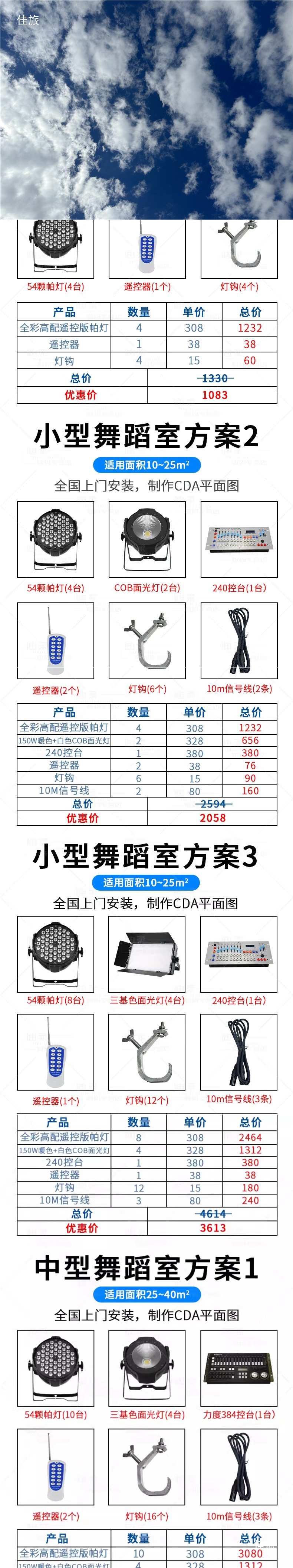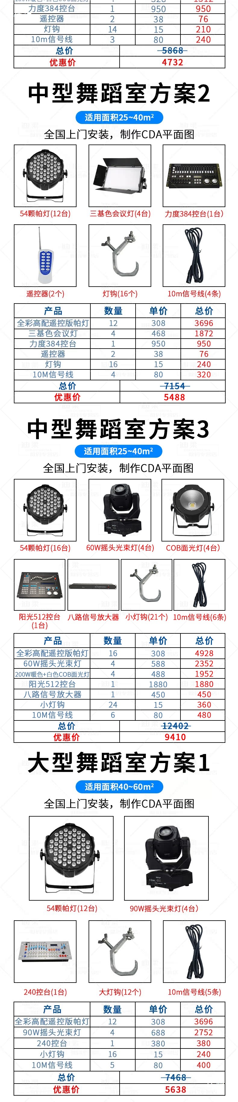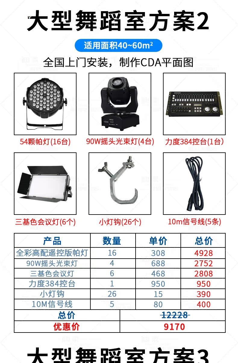 仕様 小さなダンススタジオ照明セット01,小型ダンススタジオ照明セット02,小さなダンススタジオ照明セット03,ダンススタジオ照明プラン1,ダンススタジオ照明プラン2,ダンススタジオ照明プラン3,小型ダンススタジオ照明セットA,小型ダンススタジオ照明セットB,小型ダンススタジオ照明セットC,小型ダンススタジオ照明セットD,フルカラーパーライト54個(標準制御),100W単眼COB面ライト(ポジティブホワイト+ウォームホワイト),3 原色のソフトライト (ポジティブホワイト + ウォームホワイト) (512 モデル),60w ムービングヘッドパターンライト(ブラック)(シングルプリズム),230ビームライト(ブラックシェル),250ビームライト(ブラックシェル),260ビームライト(ブラックシェル),295ビームライト(ブラックシェル),240コンソール,パワー 384 コンソール,サンシャイン512コンソール,KTVパネルコントロールパッケージ(カラオケマシンに接続可能),5m 信号線,10m 信号線,8口,ランプブラケット(高さ3m)(固定二重層8ランプ位置),小さなライトフック