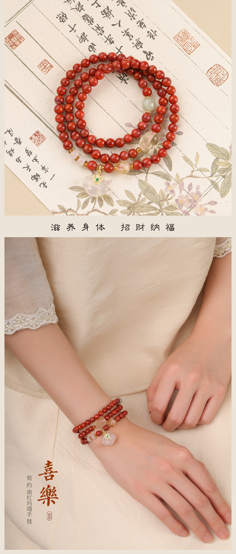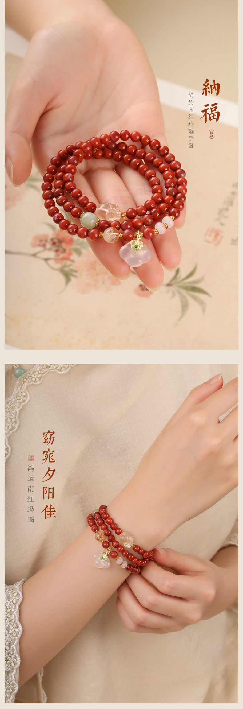 原创设计新中式国风和田玉并蒂莲手串南红玛瑙饰品手链女厂家批发