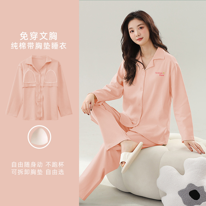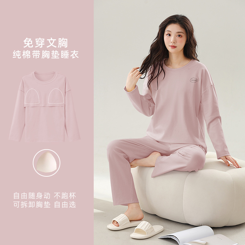 100% 純綿パジャマ女性は胸パッド丸首長袖ズボンを持っています。