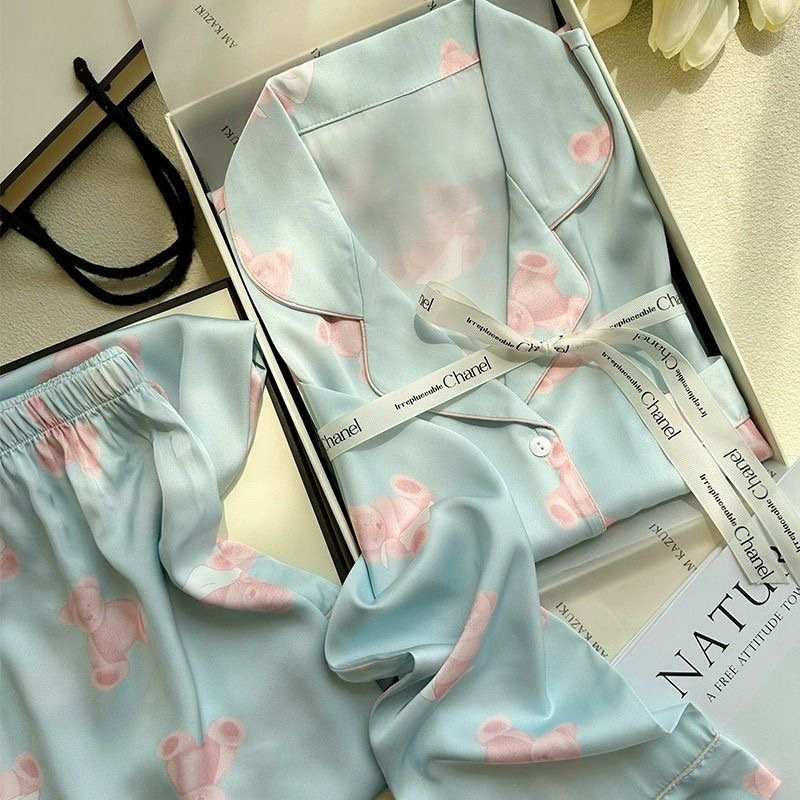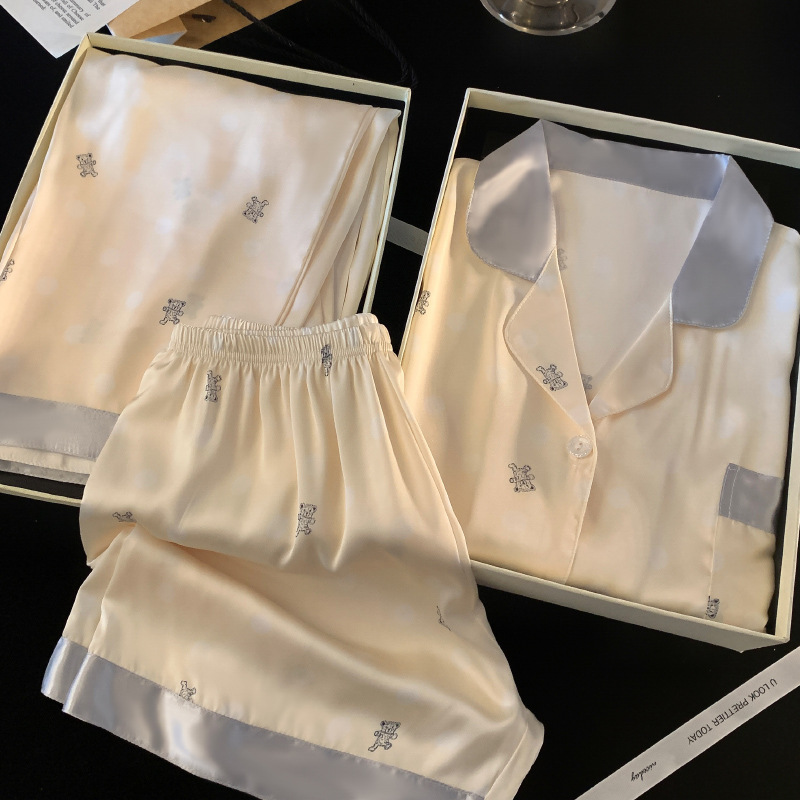 クロスボーダーカーディガンカジュアルスリーピースレディースホームパジャマ春夏新作アイスシルク半袖クマプリント卸売