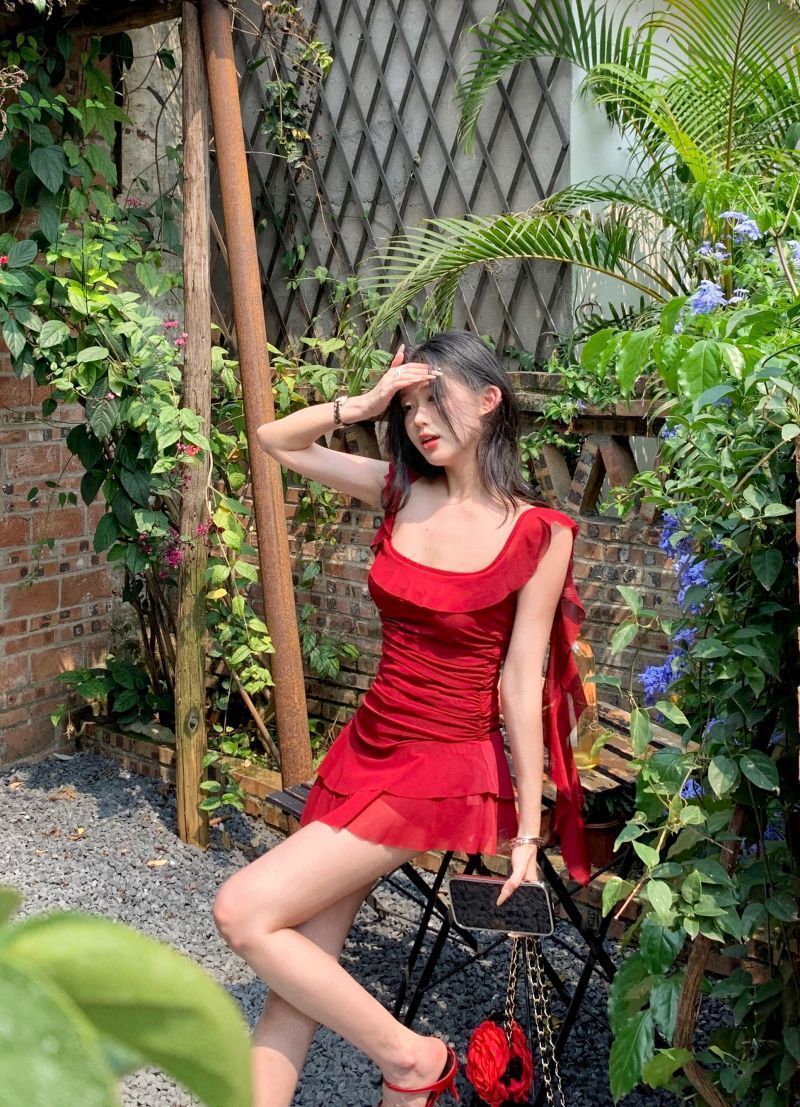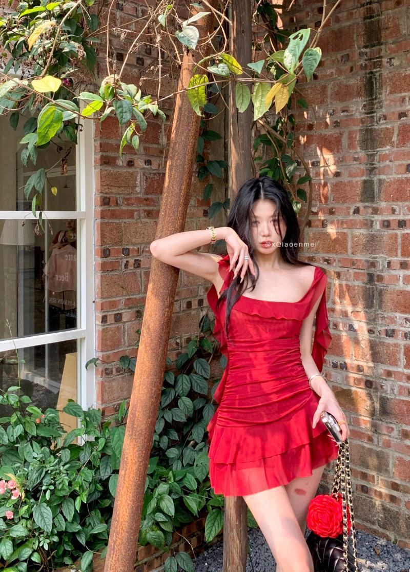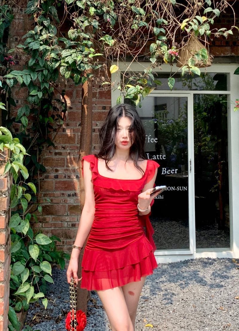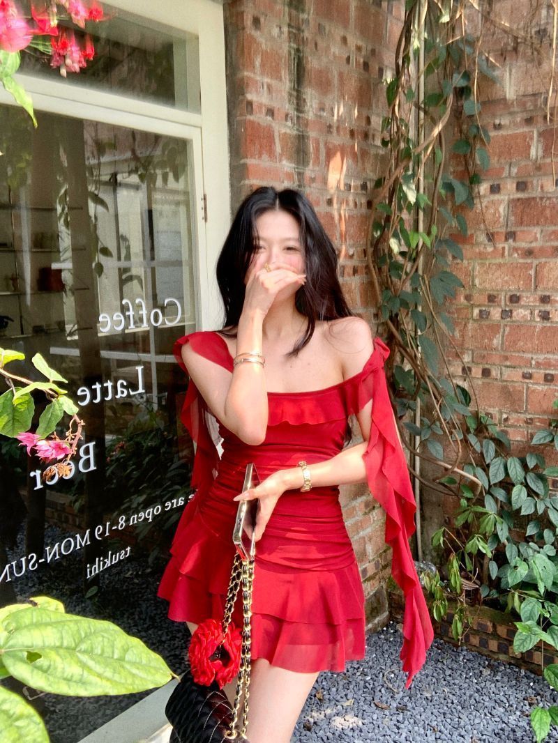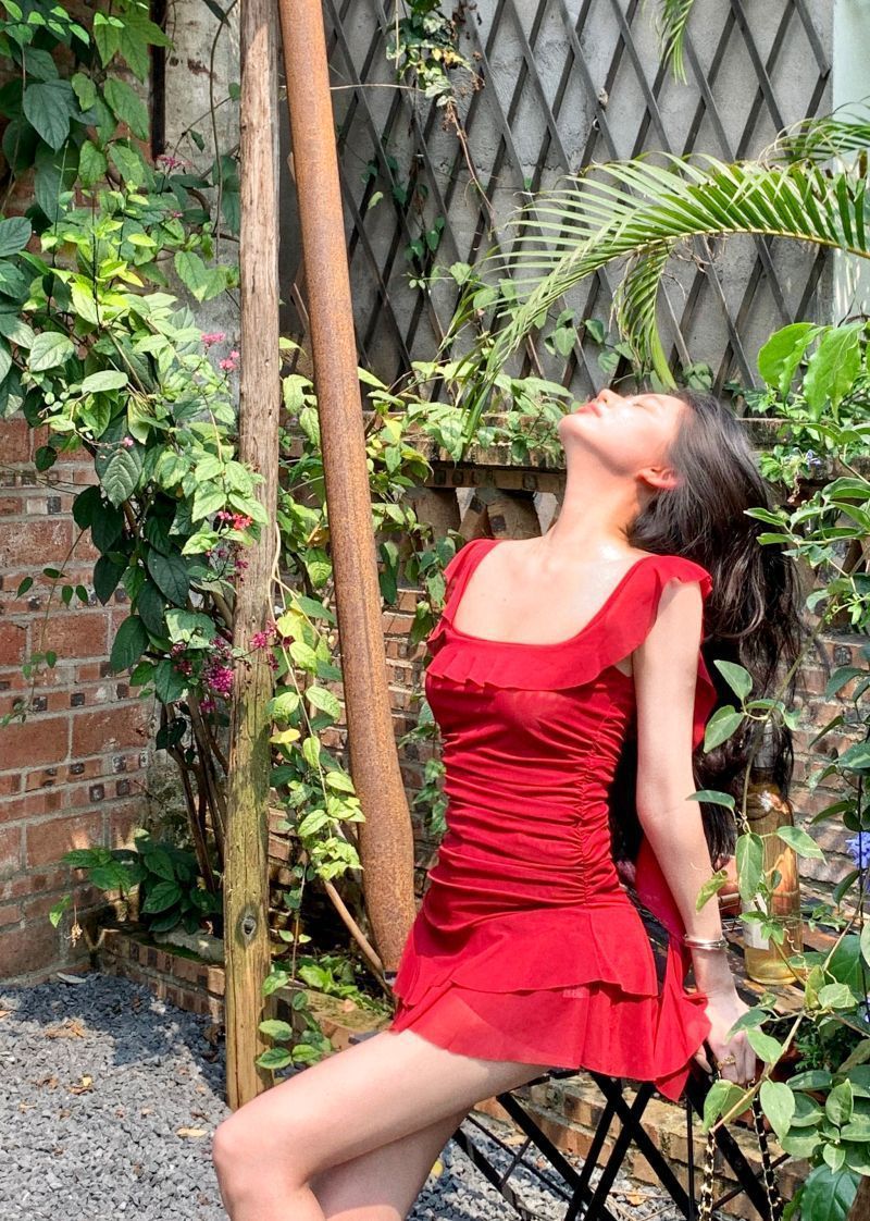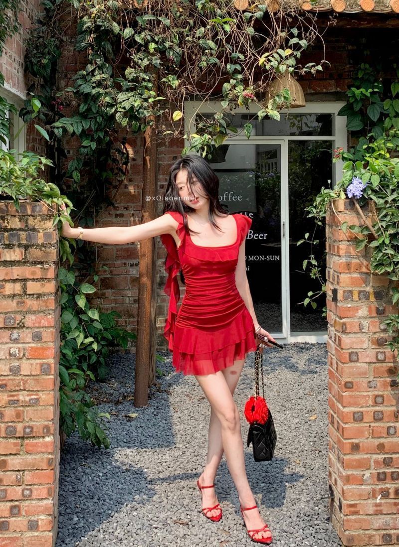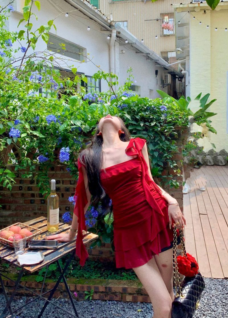 韓国風レッドフリルスクエアネックキャミワンピース レディース 夏 プリーツスカート キュートでセクシーなショートスカート