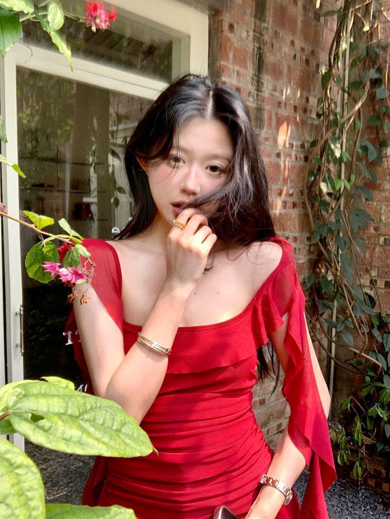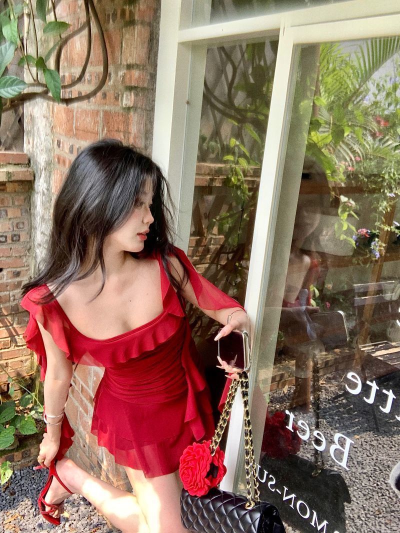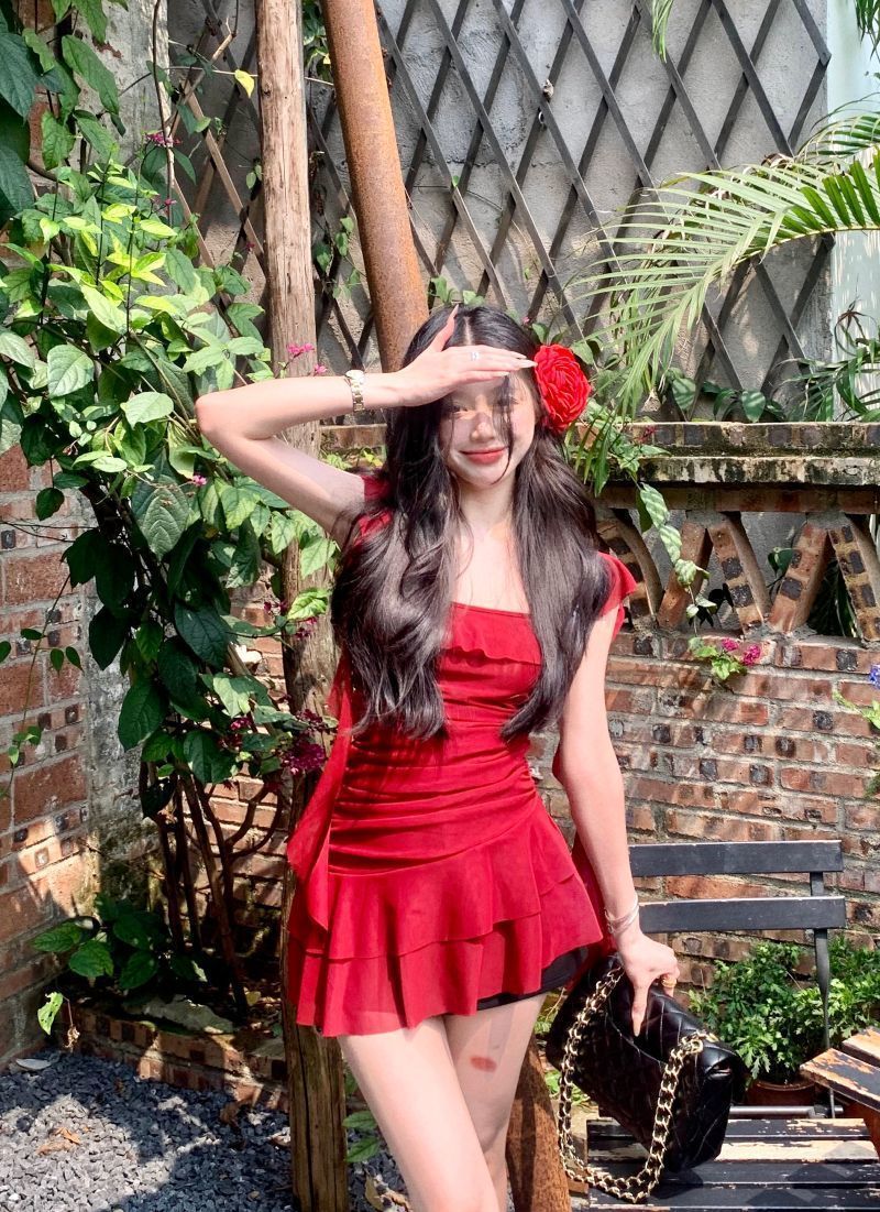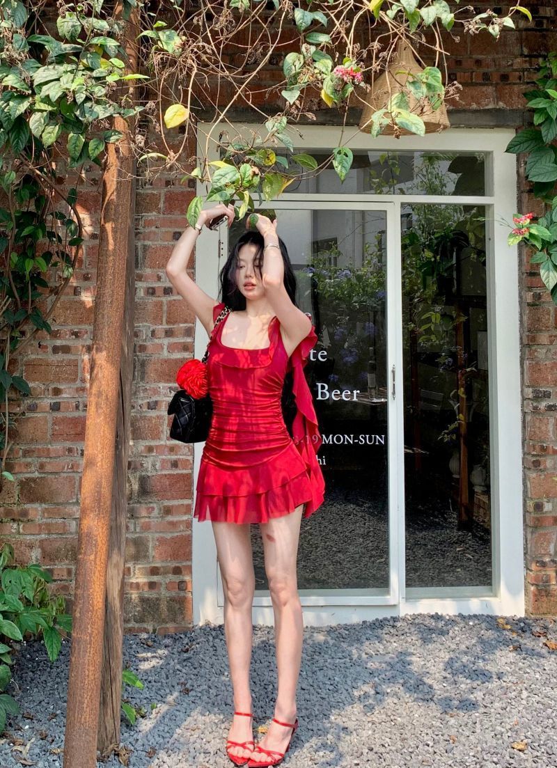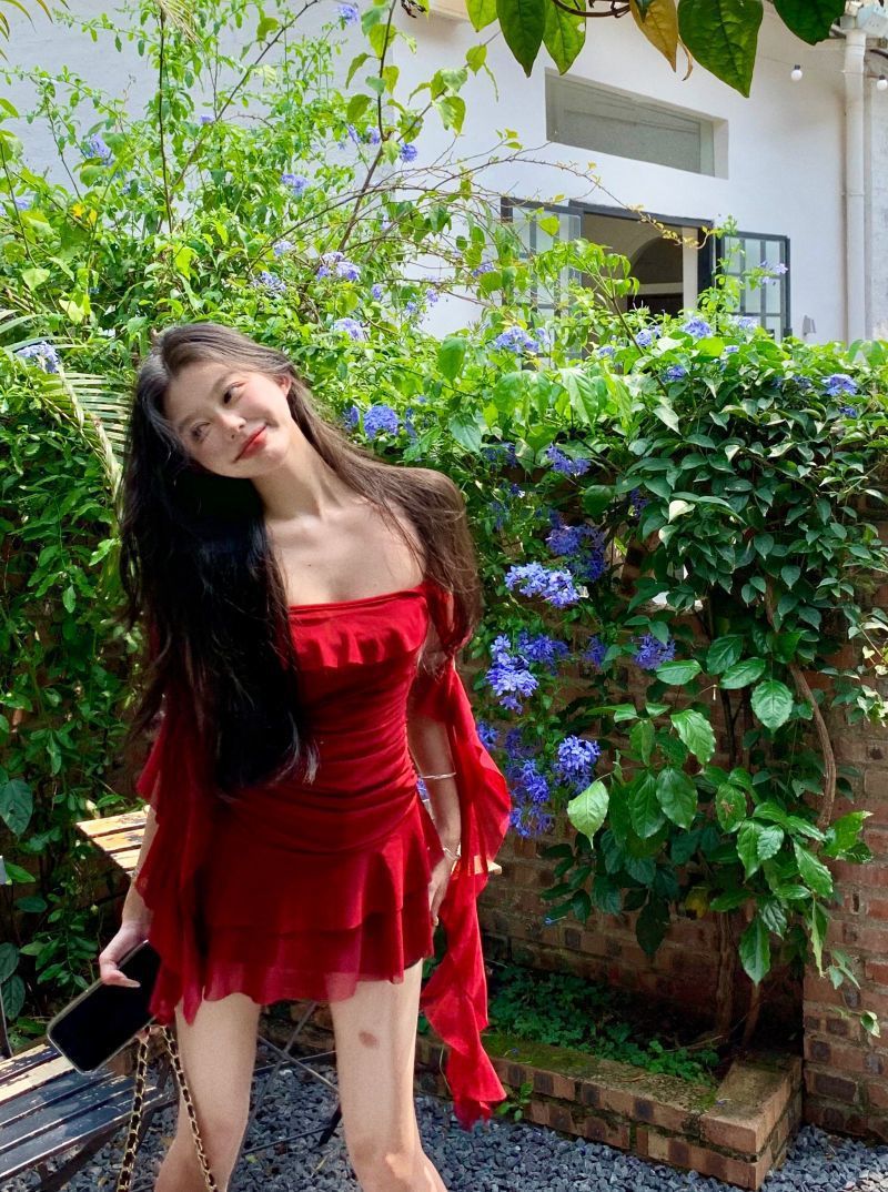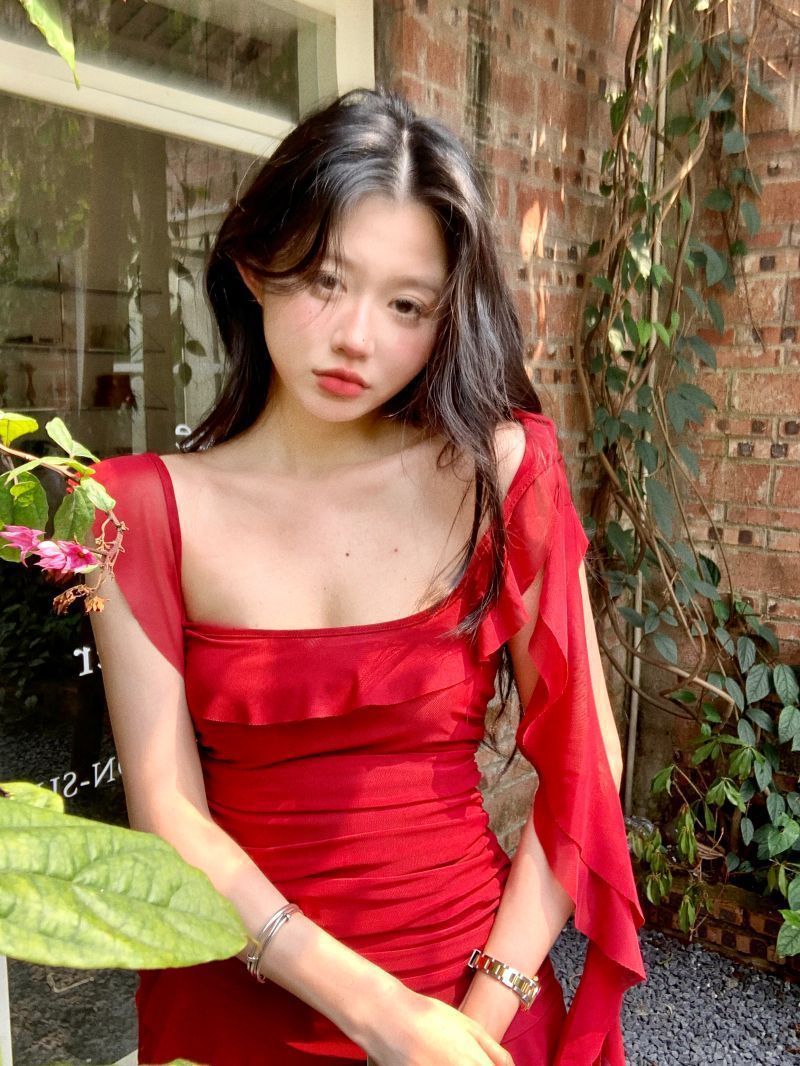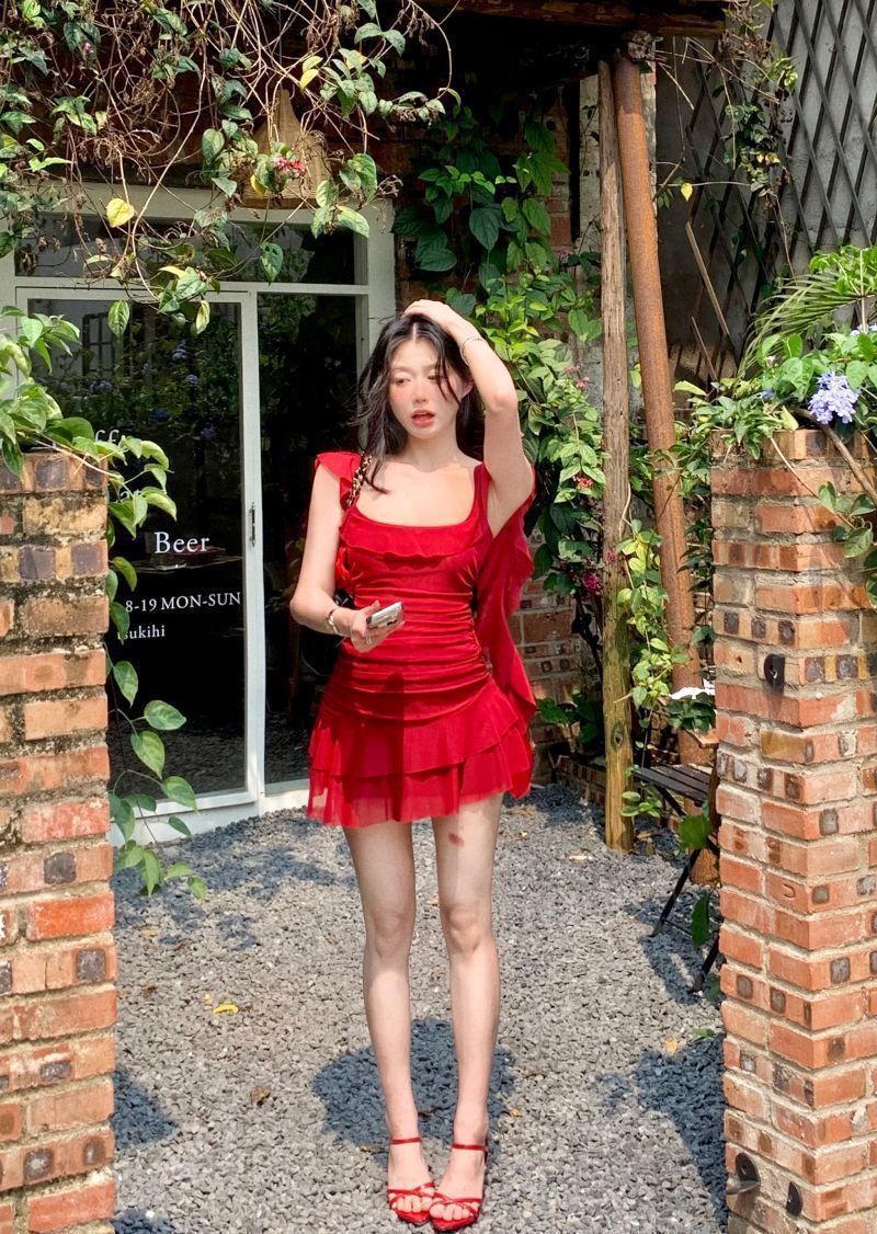 韓国風レッドフリルスクエアネックキャミワンピース レディース 夏 プリーツスカート キュートでセクシーなショートスカート