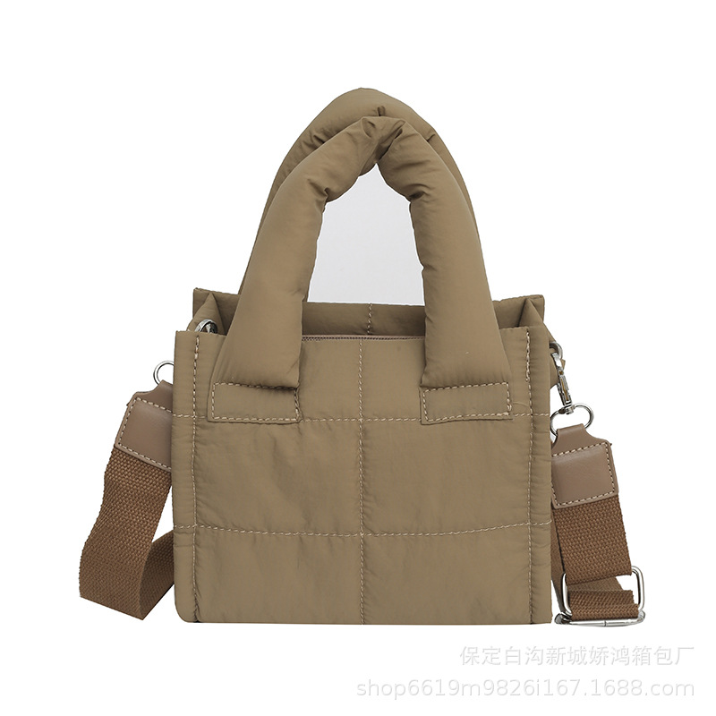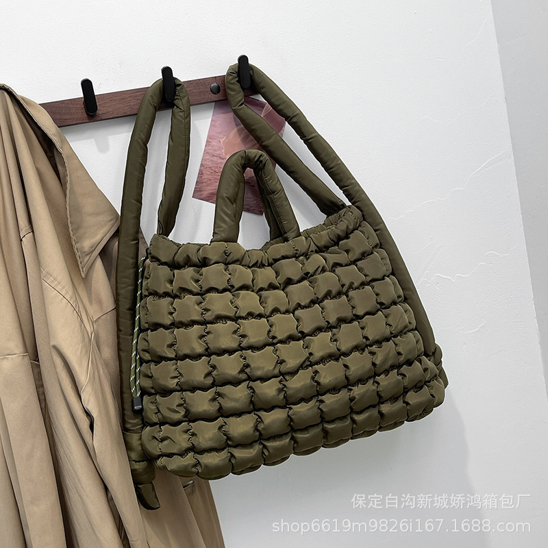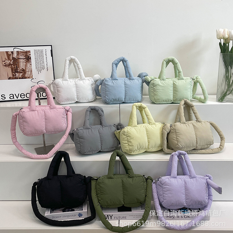 クロスボーダー2025綿入りハンドバッグ軽やかでファッション的なダウンバッグ女性ブロックのトートバッグカジュアルなバッグ
