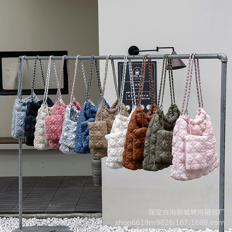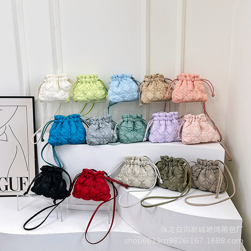 韓国の新型菱格バケツバッグ2023秋冬ファッションしわ雲バッグダウンシングル肩斜め掛けショッピングバッグ