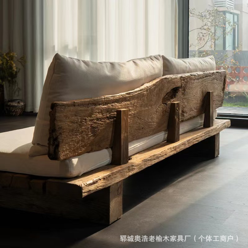 定制老榆木实木沙发床黑胡桃色直排原木沙发复古做旧风化木沙发