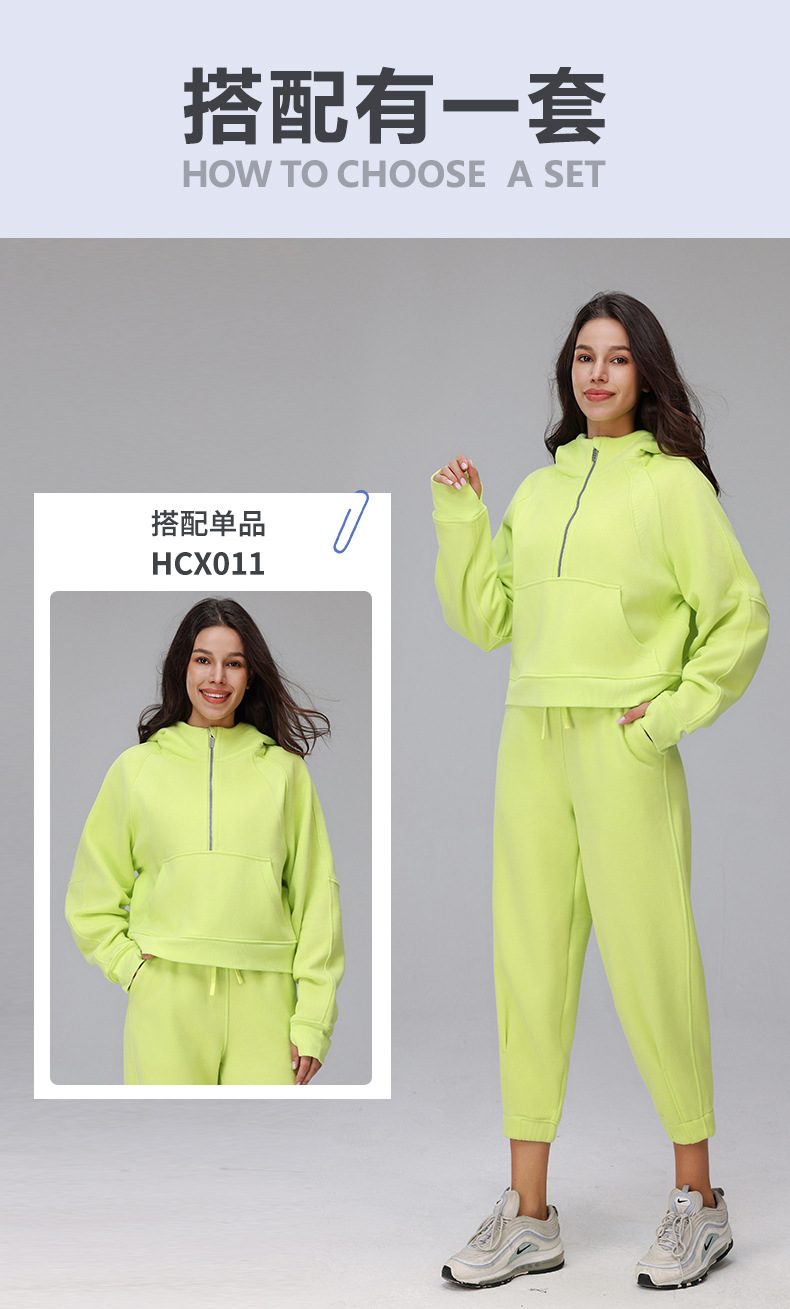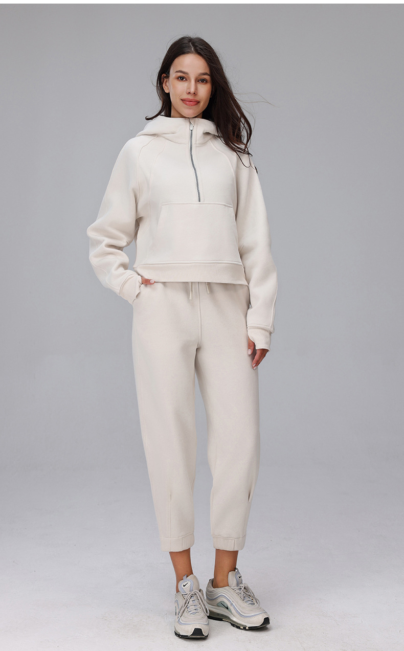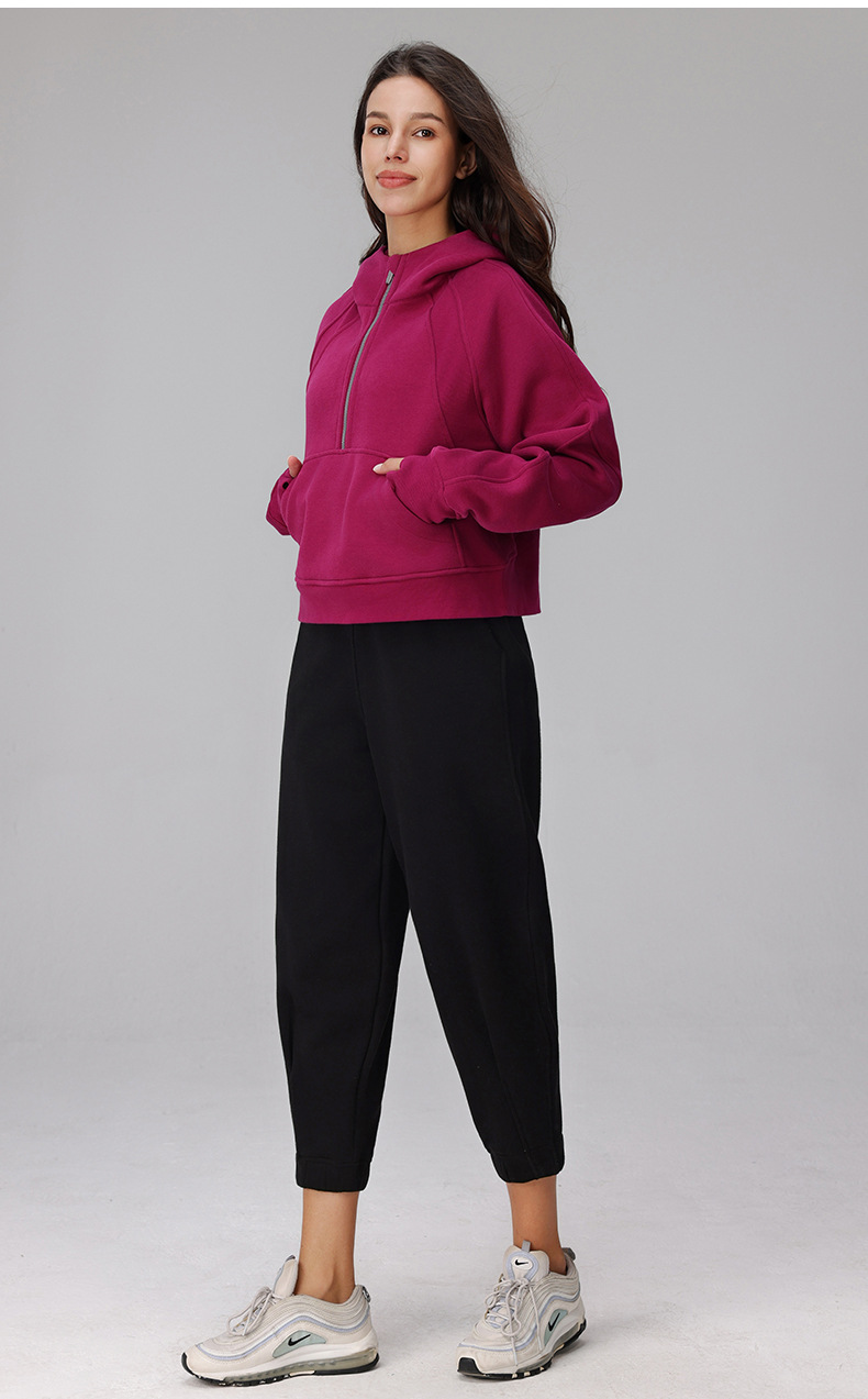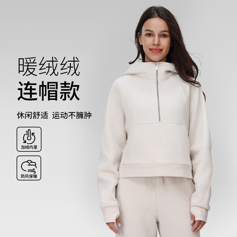 秋と冬のベルベット暖かいハーフジップフード付きスウェットシャツルーズアウター厚みのあるスポーツフィットネスカジュアルヨガジャケット女性用