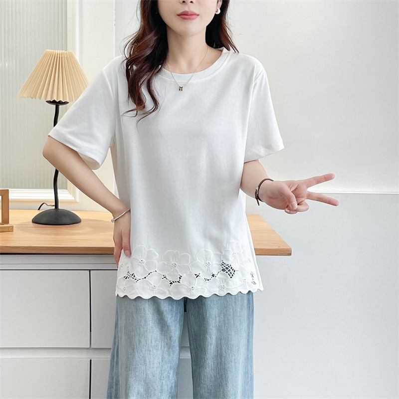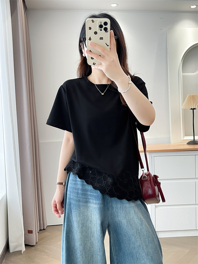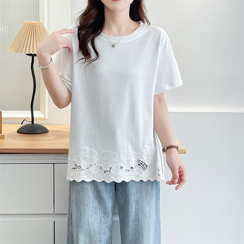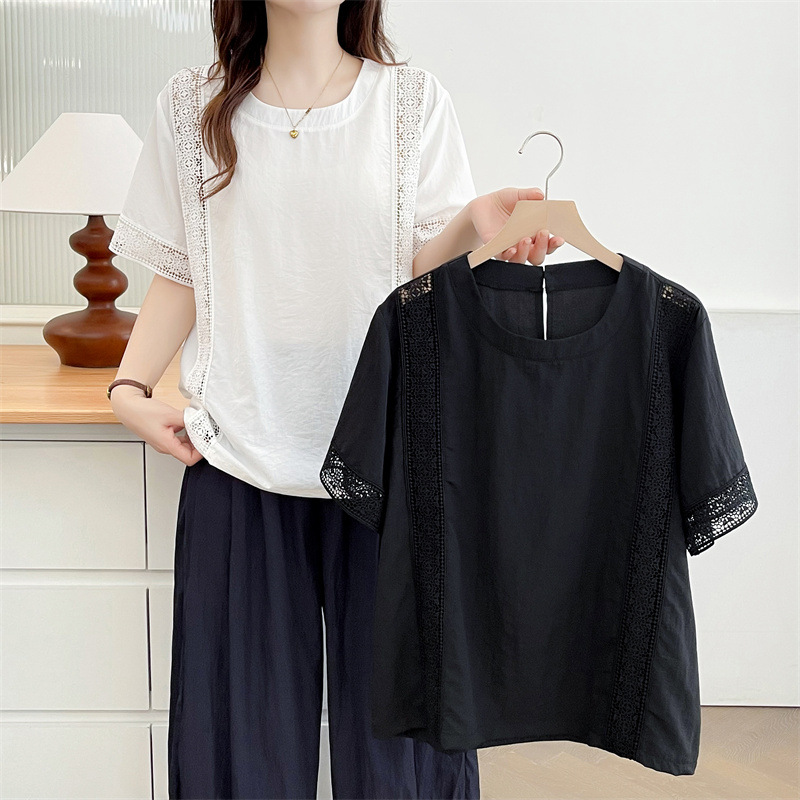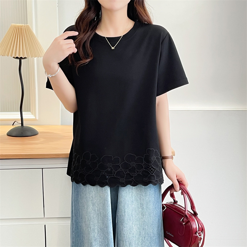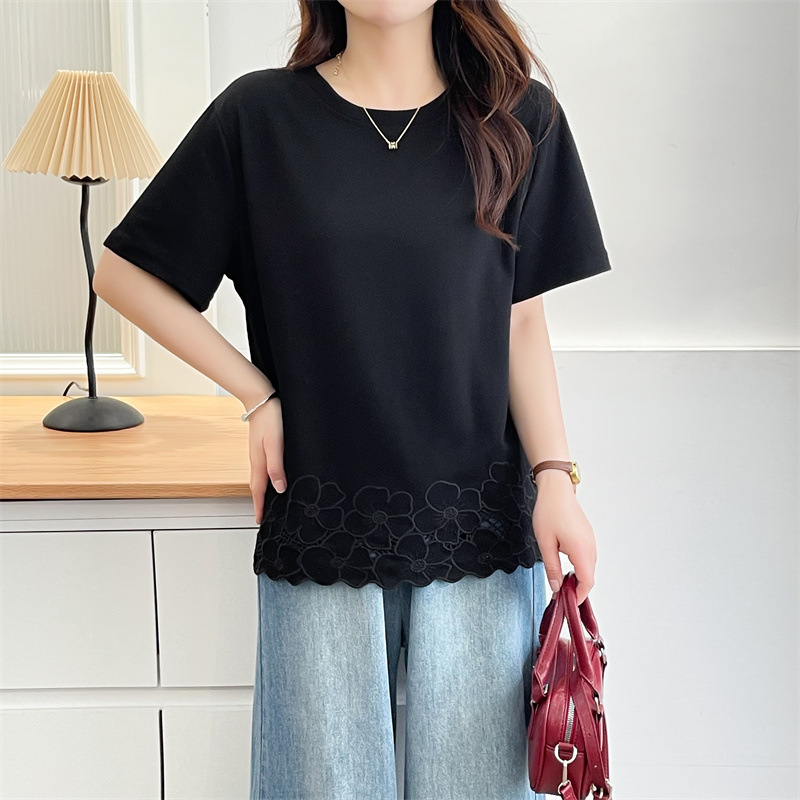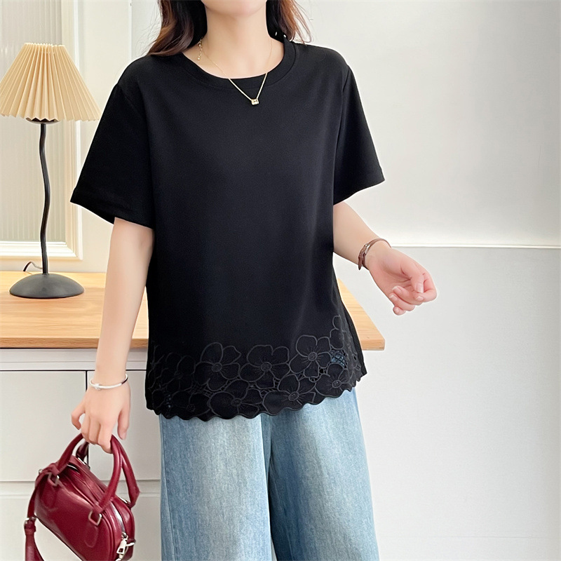 2025 夏大きいサイズの女性のシャツ半袖レース中空 Tシャツファッショナブルなシンプルなファット mm トップ多用途ニッチ 666
