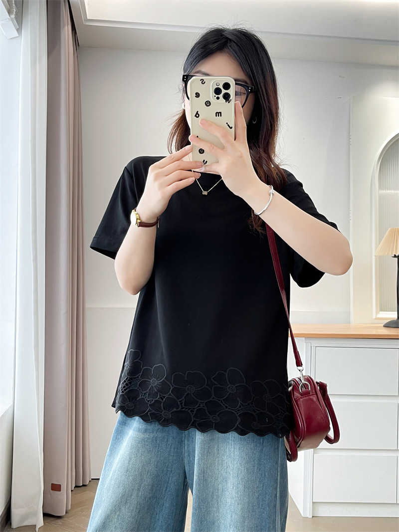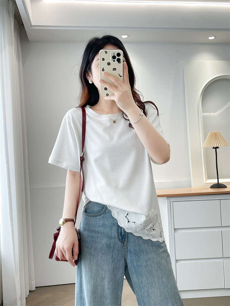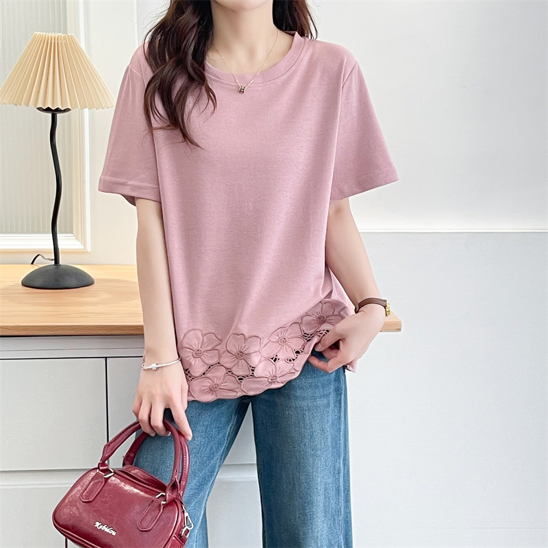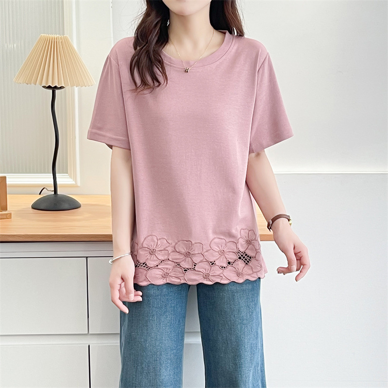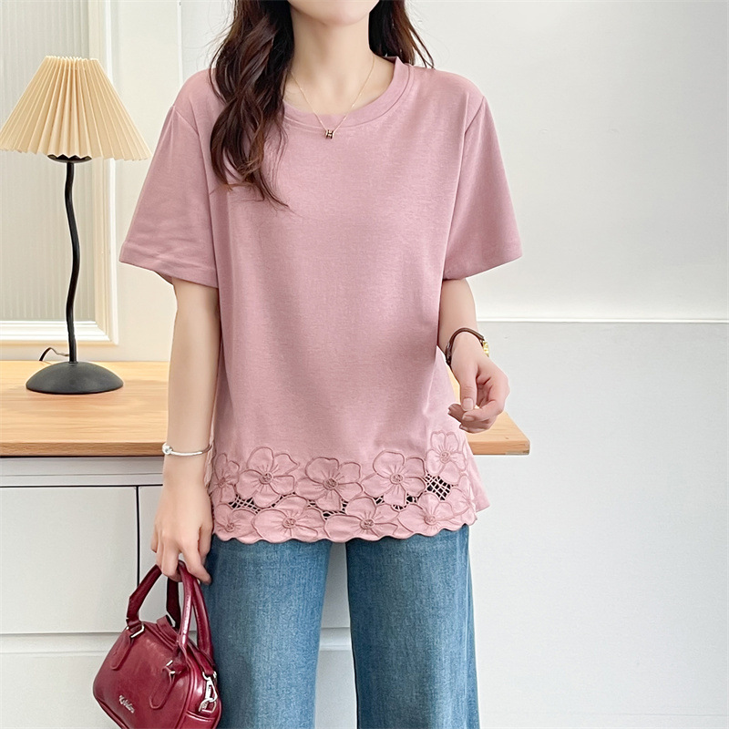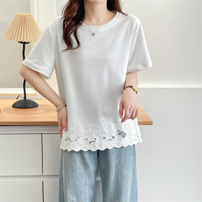 2025 夏大きいサイズの女性のシャツ半袖レース中空 Tシャツファッショナブルなシンプルなファット mm トップ多用途ニッチ 666