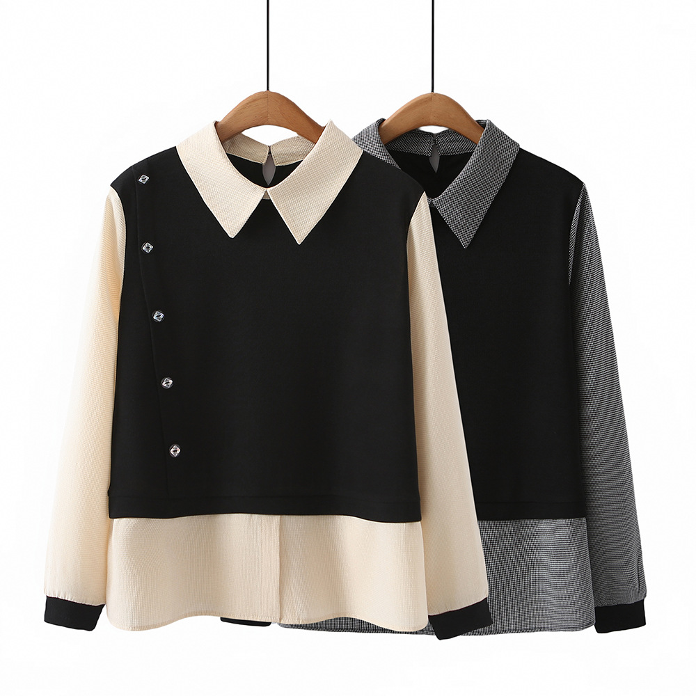 大きいサイズの婦人服の上着の偽の2枚の色合わせの子供のシャツの長袖の春の服の新型の2024格子のtシャツの太ったmm296