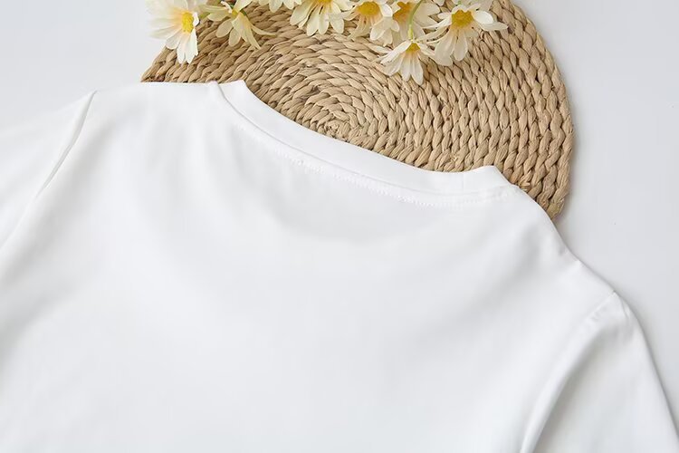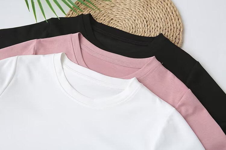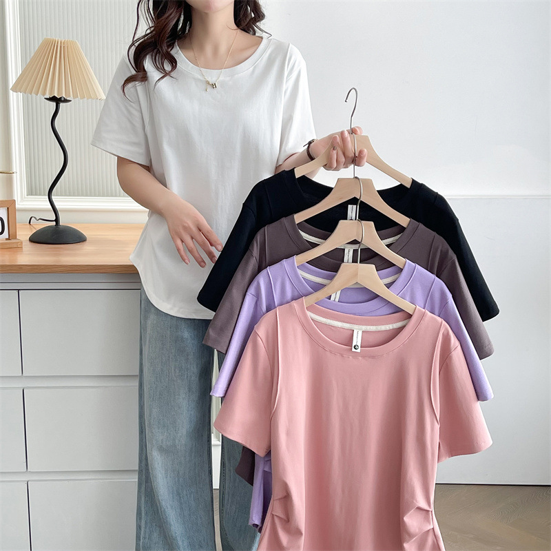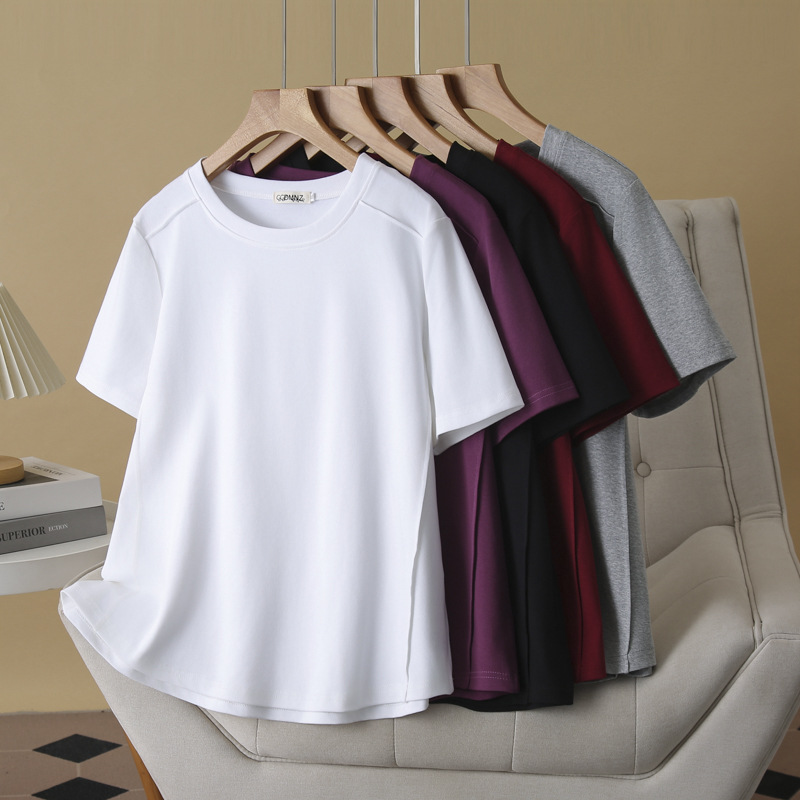 2025夏のシンプルなtシャツ半袖の大きいサイズの婦人服の丸首のしわの上着の弾力性は純色の中に合わせます。