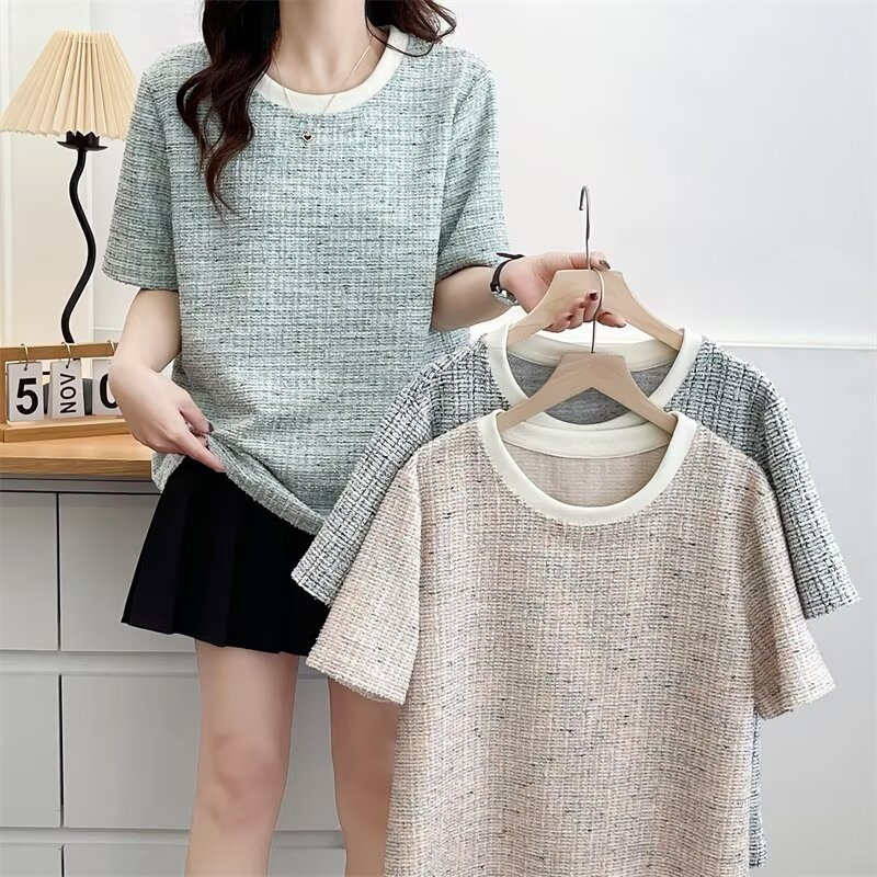 大きいサイズの婦人服のtシャツの半袖の2025夏の朝の夏の上着の小さい香風の太っている妹の格子縞の思いやりはやせている665を現します。