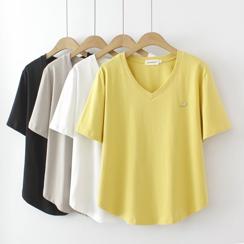 大きいサイズのtシャツの半袖の婦人服のvネックの2024夏綿のTは簡単で、カジュアルな上着に合わせてやせている太っている妹のシャツ7082を現します。