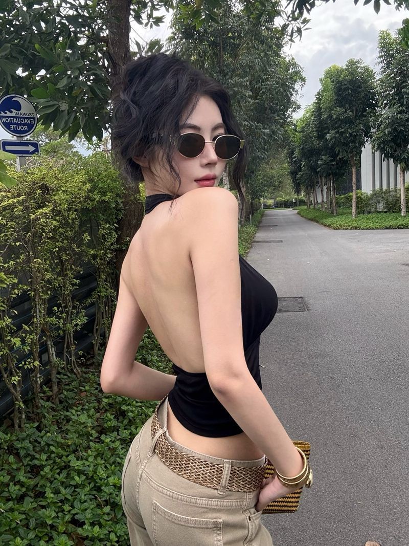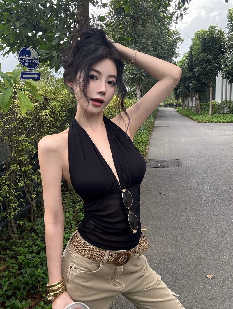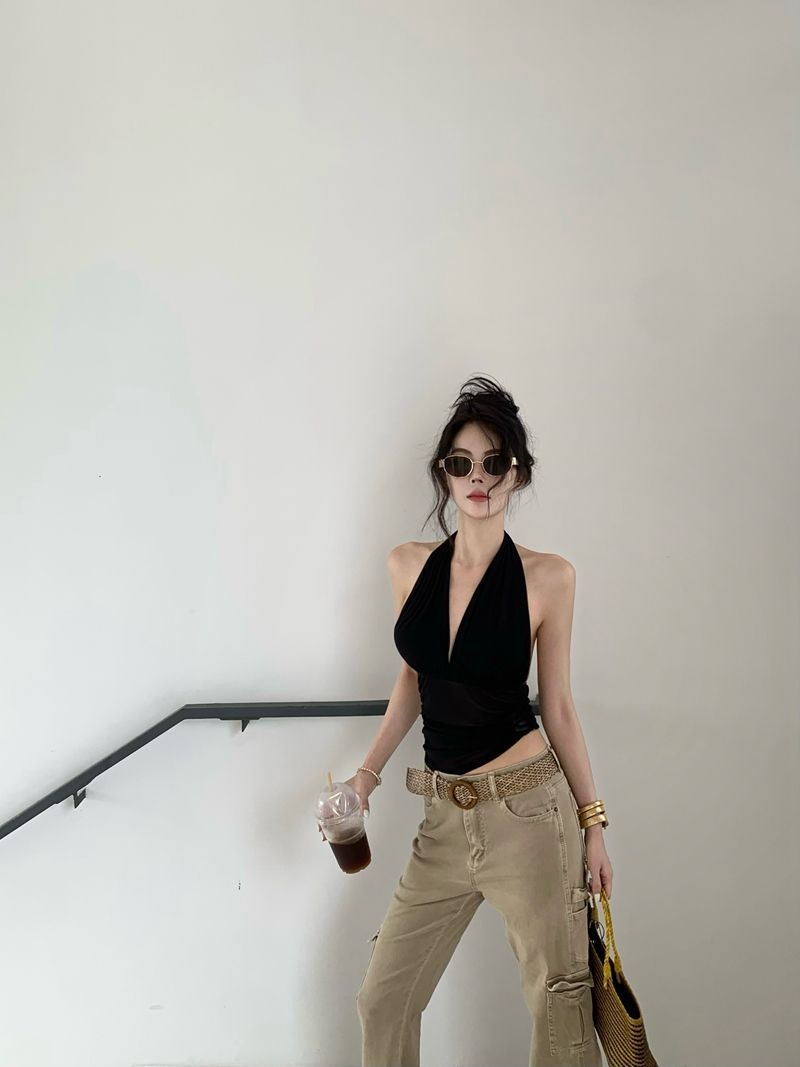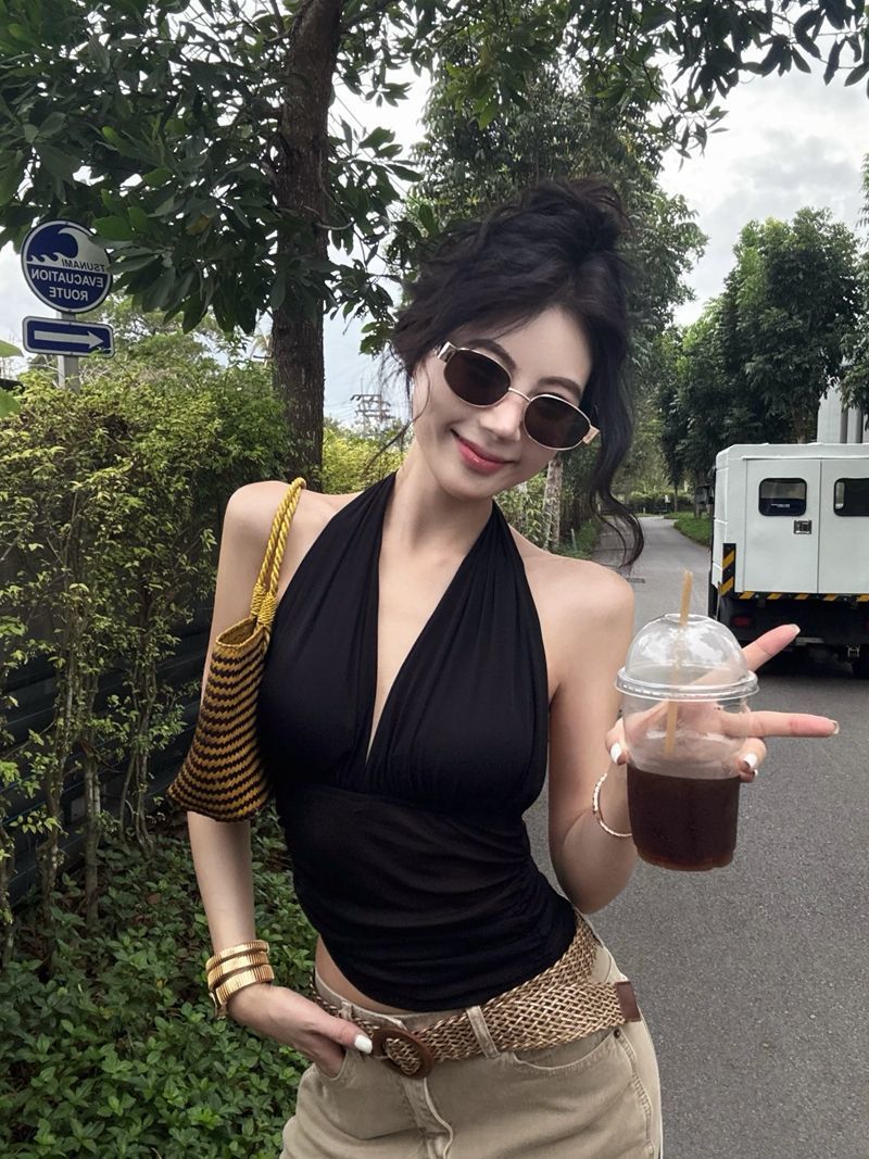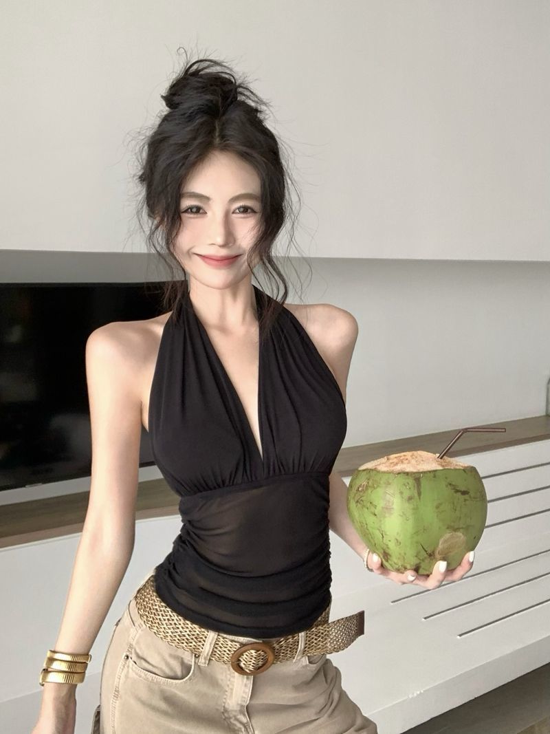 ホットガールホルターネック黒キャミソールレディースアウターウェア2025夏ローブーバークノースリーブバックレスインナーメッシュショートトップ