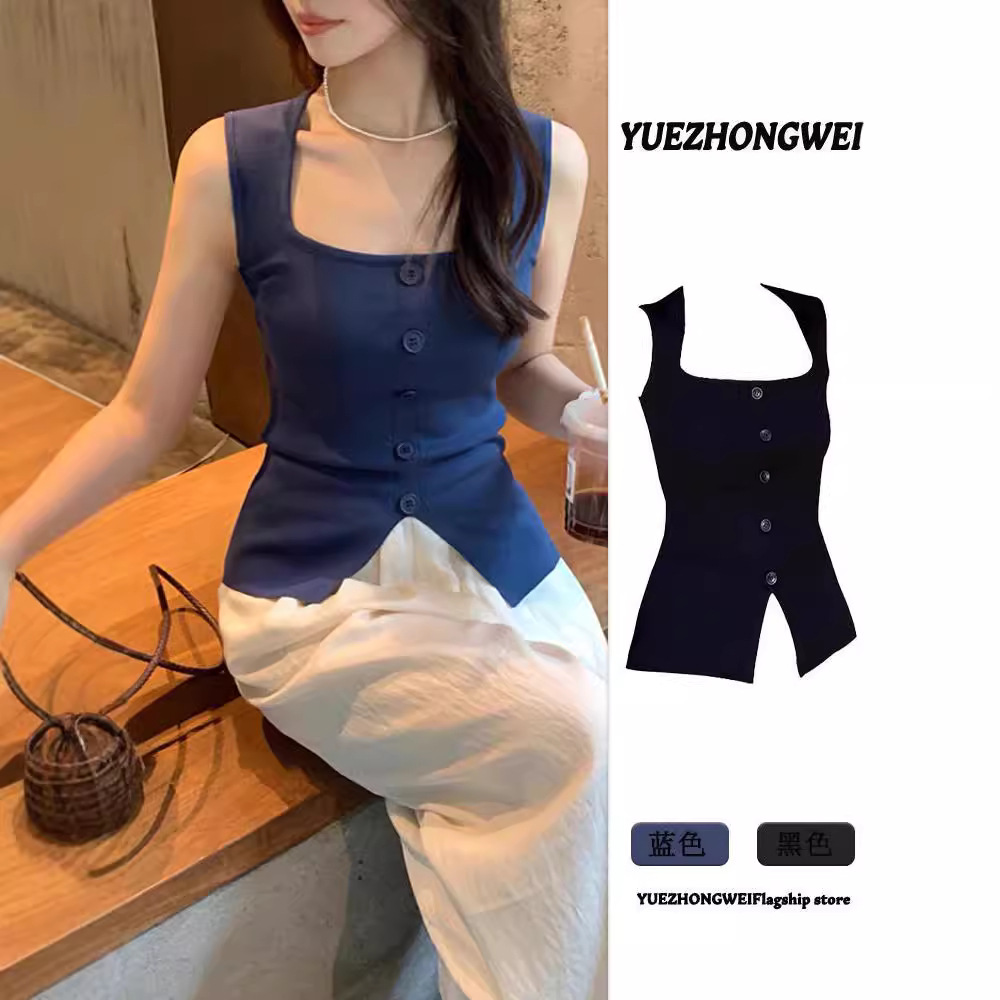 韓潮の方襟の氷の糸のサスペンダーのベストの女性の夏の外は独特な修身のギャルの短いタイプの袖なしのオープンフォークの上着を着ます。