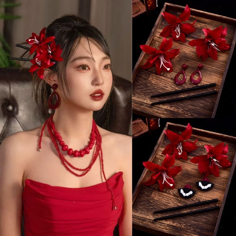 新中式新娘发饰头饰红色结婚耳饰民族风彼岸花晨袍订婚头饰一整套
