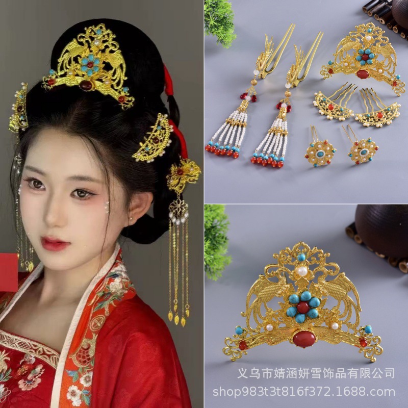 古代唐風の金色のヘアクラウン、ウェディングヘアアクセサリーセット、多用途の額クラウン、タッセルヘアピン、ヘアピン、漢服の皇后のヘアアクセサリー