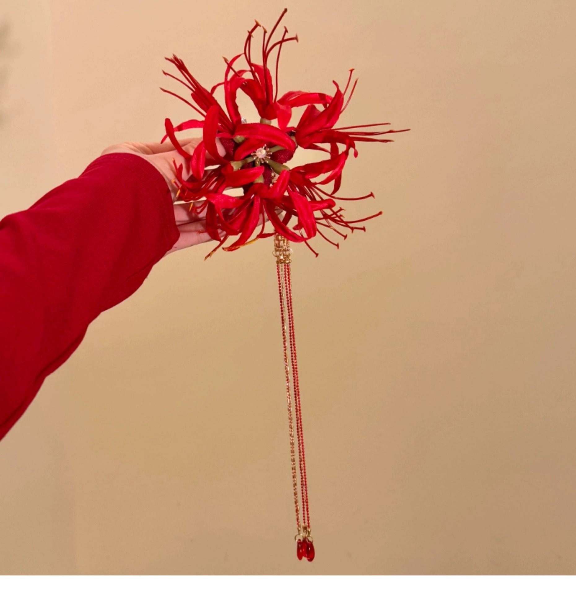 赤い彼岸の花の超仙の髪はかんざしを挟みます。