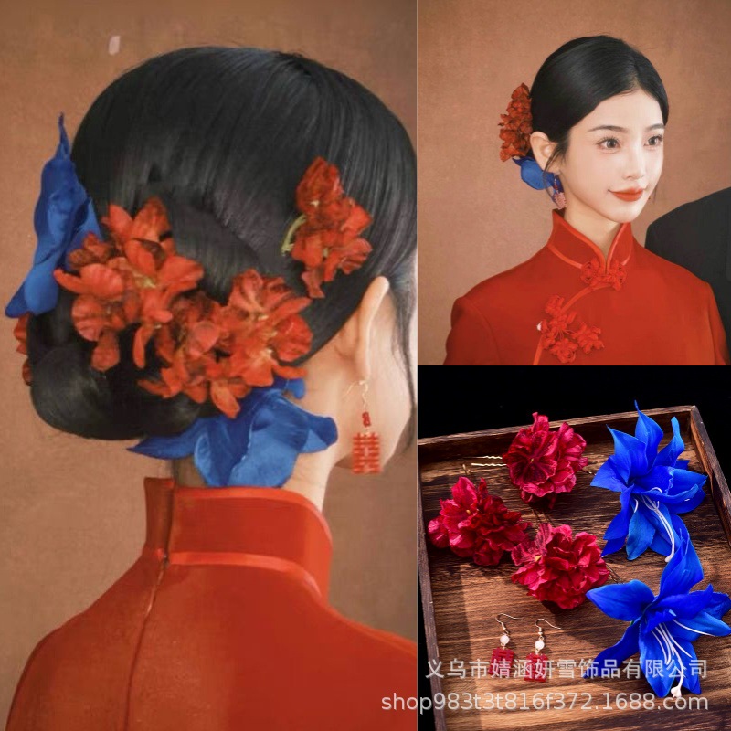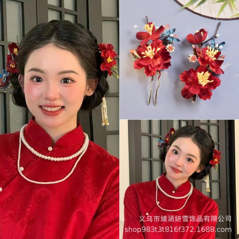 花嫁2025中国式頭飾りチャイナドレス赤い花結婚ヘアピン髪飾り朝服敬酒アクセサリーセット
