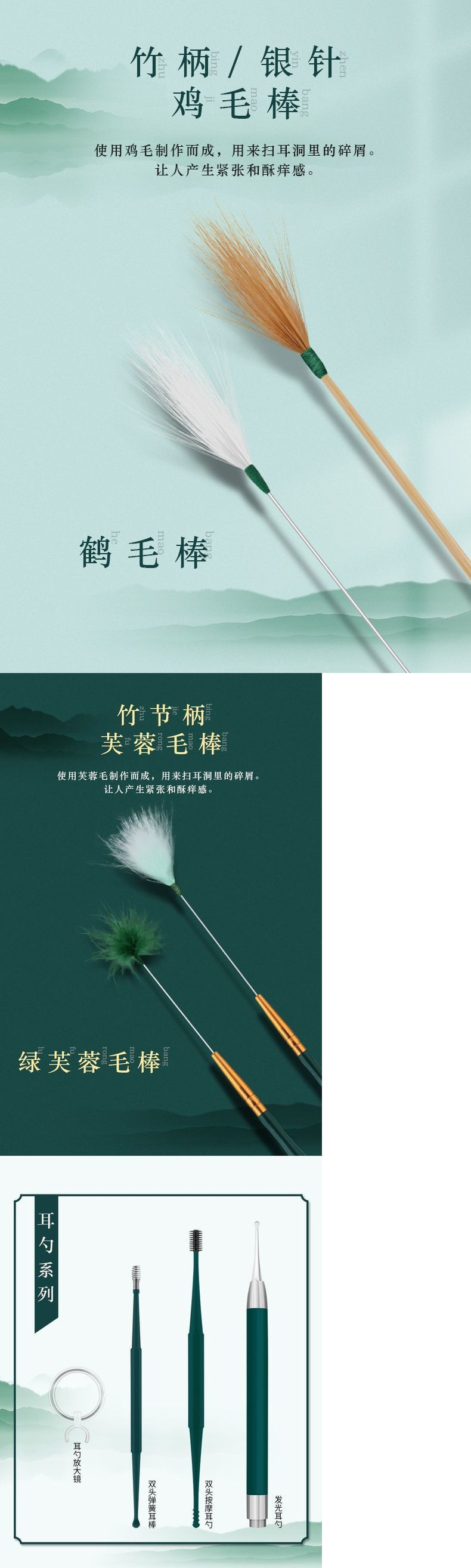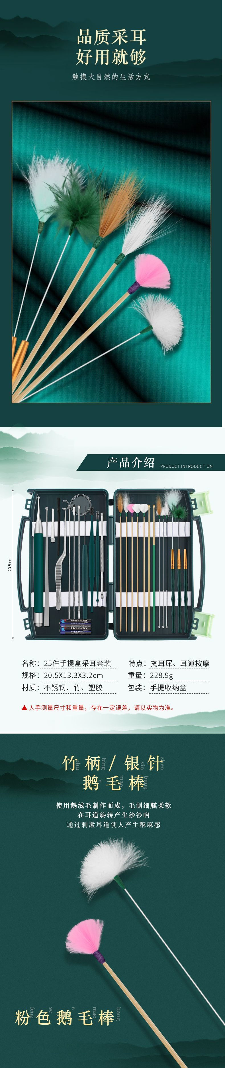 耳かきツール一式、上級技術者専用セット、耳かき用グースフェザースティック、家庭用耳かきスプーン(ライト付き)