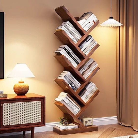 無垢材ツリー型本棚ラバーウッド床置き収納ラックホテル書斎ホームリビングルーム省スペース収納ラック