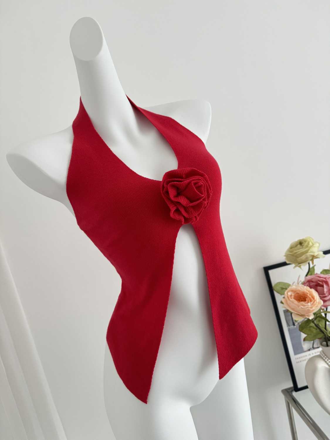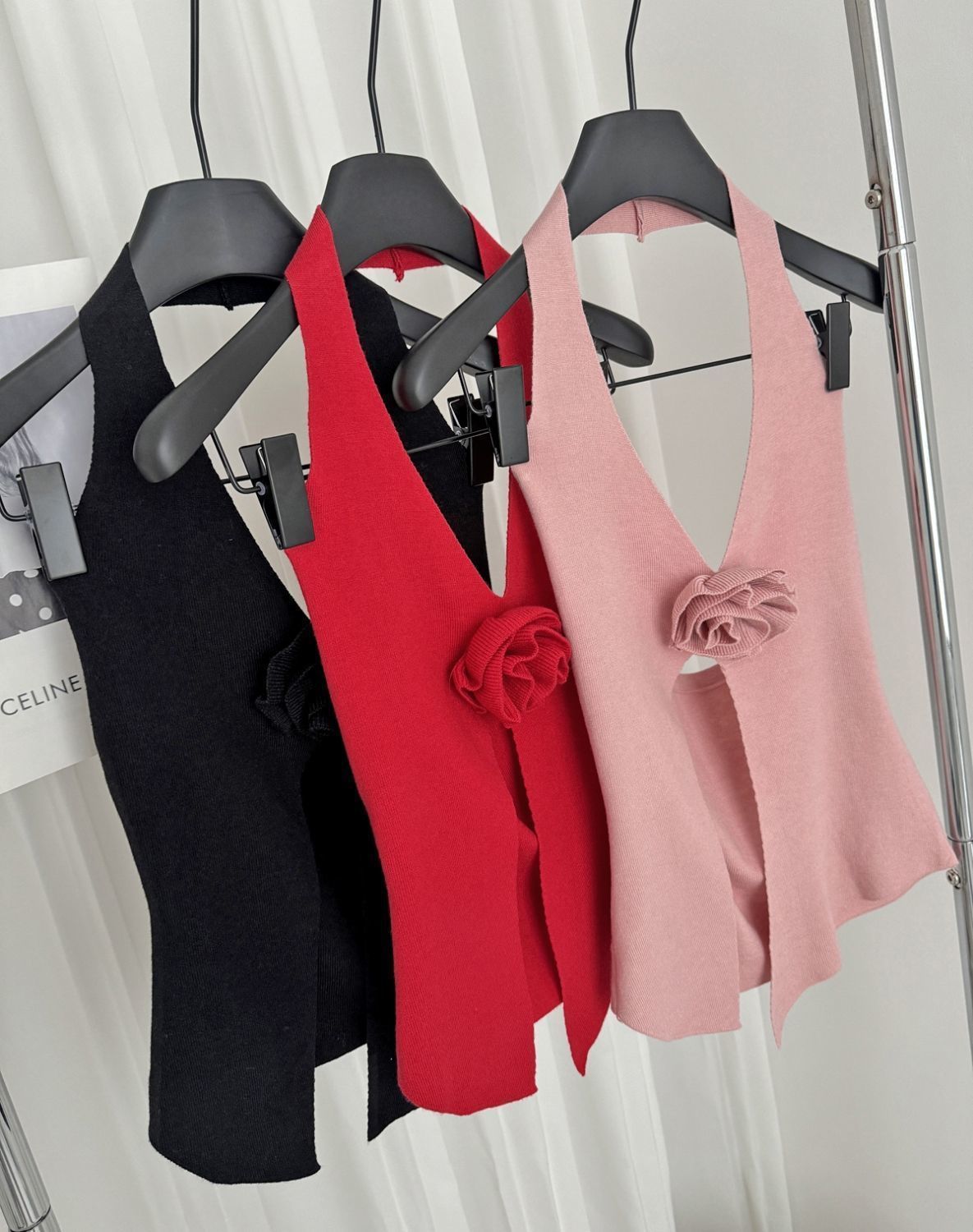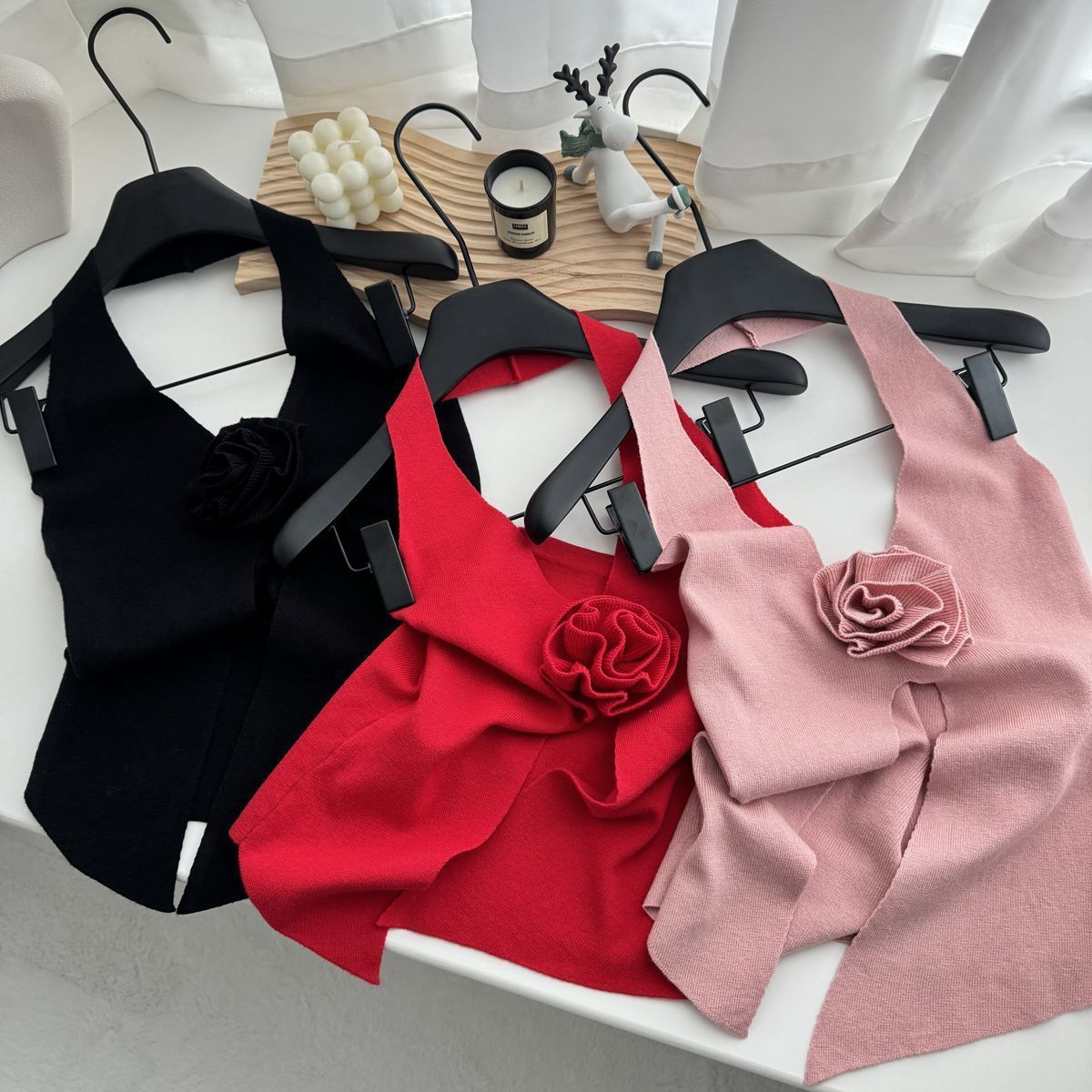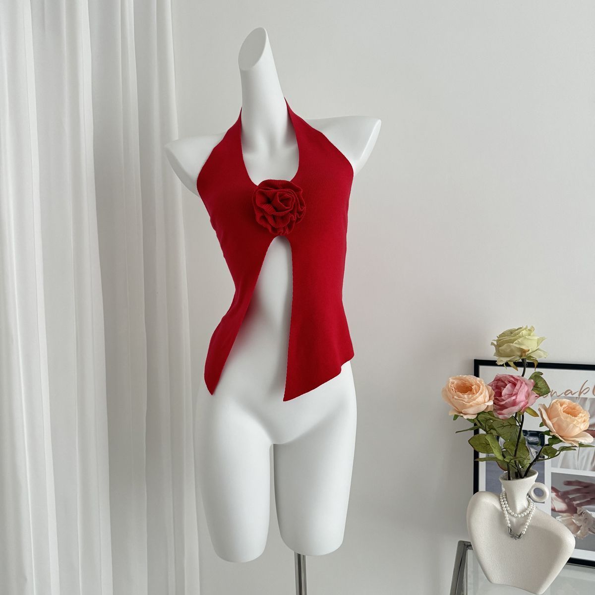 【20枚で送料無料】ホットガール立体フラワーホルターネックキャミソールレディース不規則韓国風スリットピュアデザイアトップ