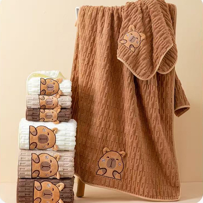 漫画カピバラ柄コーラルベルベットタオル 可愛い 厚手 柔らかい 吸水性抜群 毛抜けなし 洗顔タオル バスタオルセット