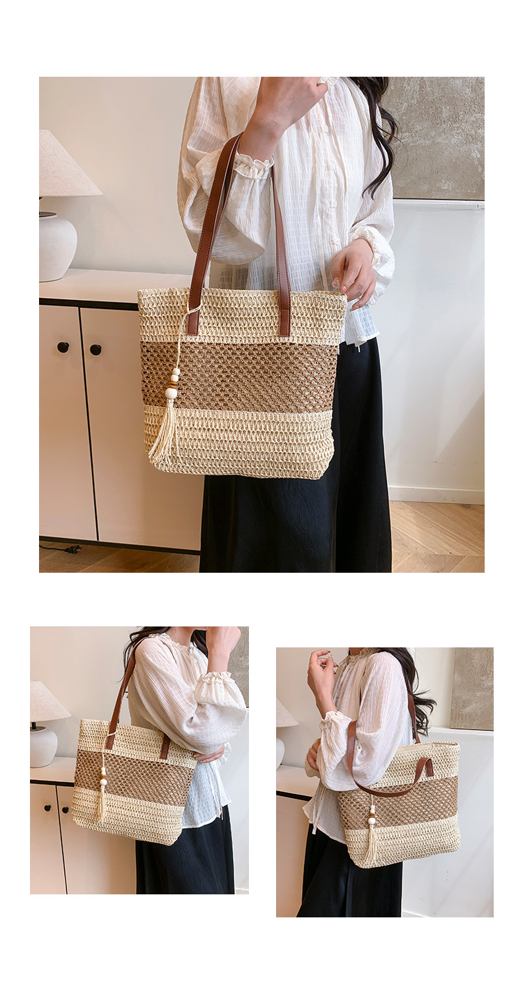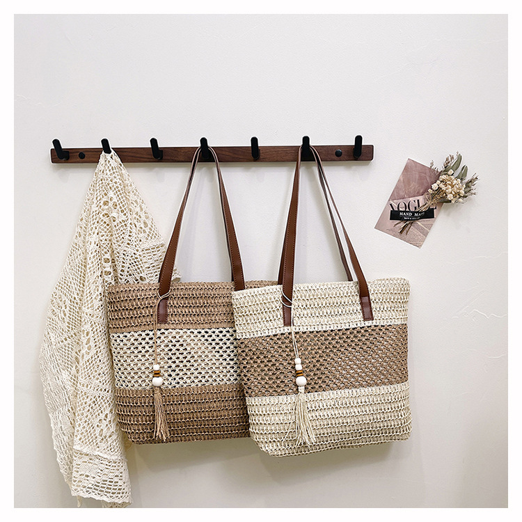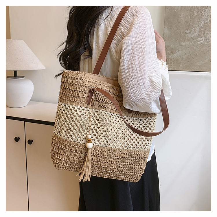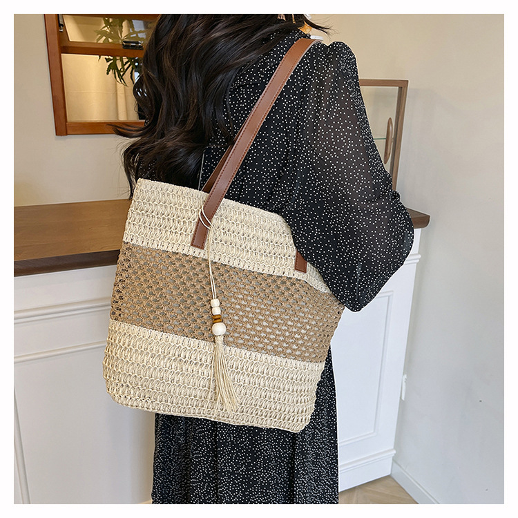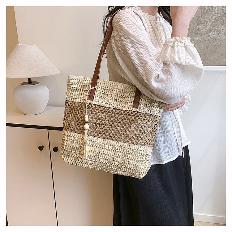 2025 夏の新休暇スタイルビーチコントラストカラーわらバッグファッション中空大容量スプライシングタッセルトートバッグ