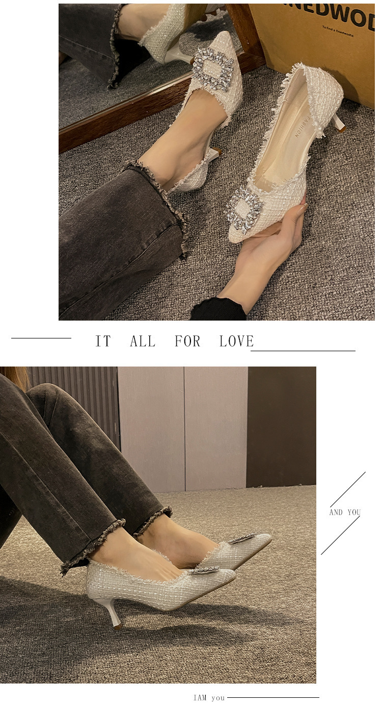 ハイヒールの女性2025年の夏の新型の大衆はフランスの尖った靴と小さい香りの風のドリルの靴を設計します。
