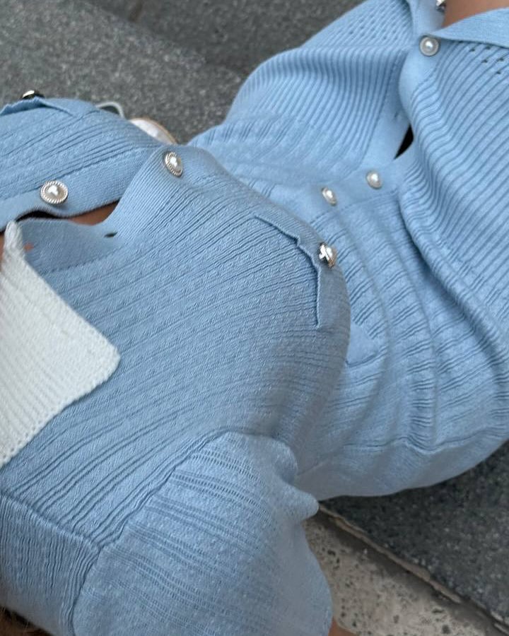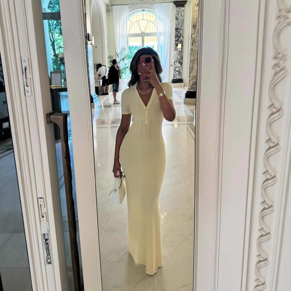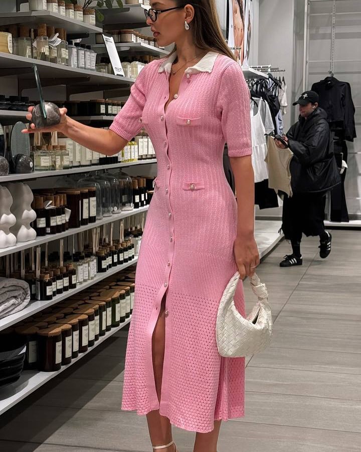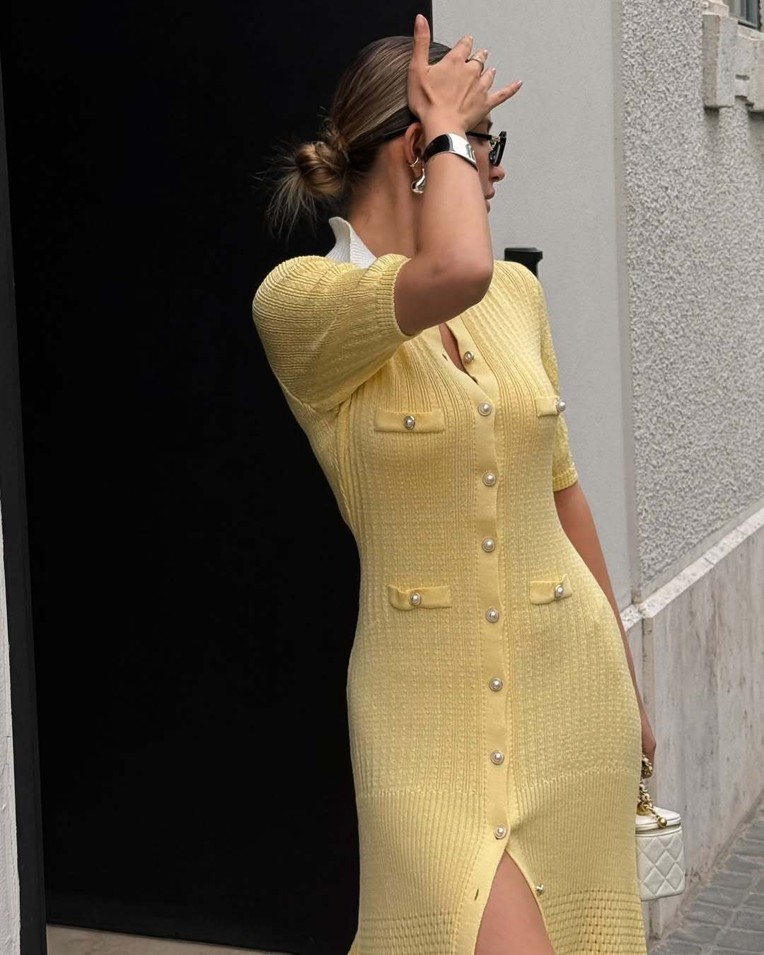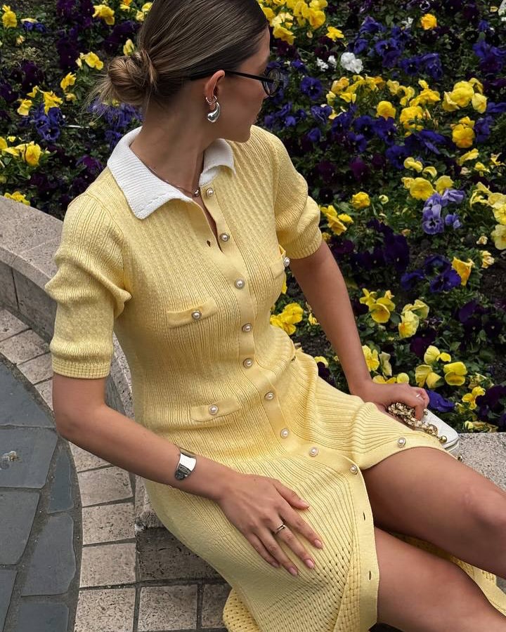 法式单排扣长款V领翻领高腰黄色针织开叉连衣裙撞色娃娃领连衣裙