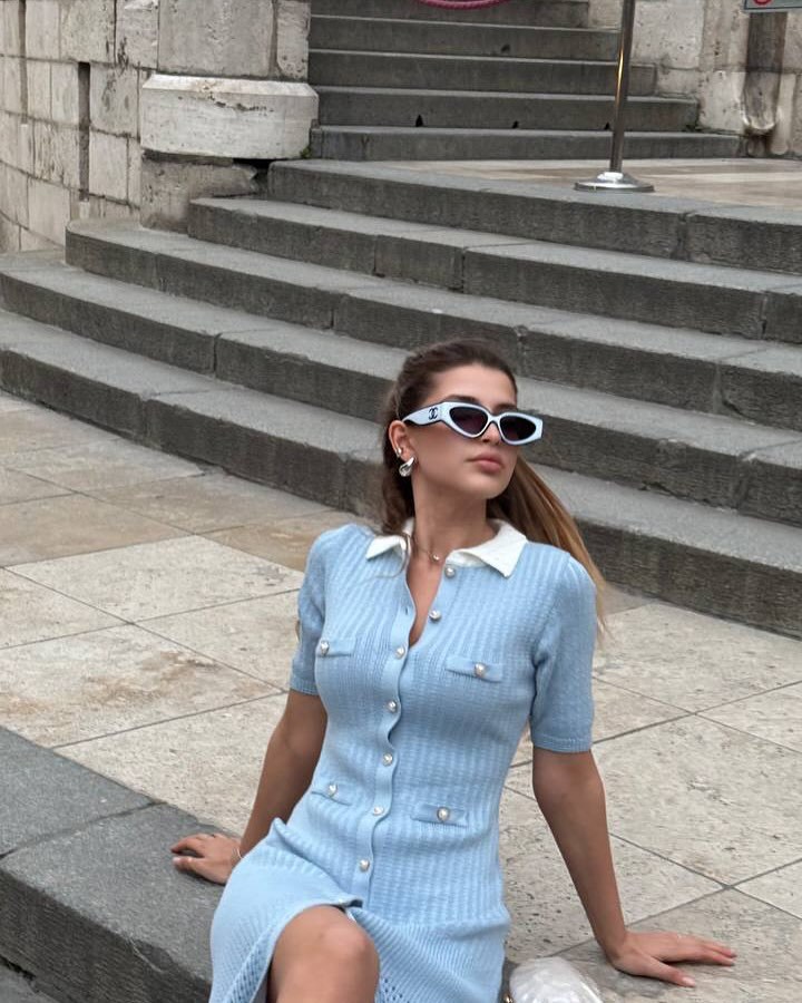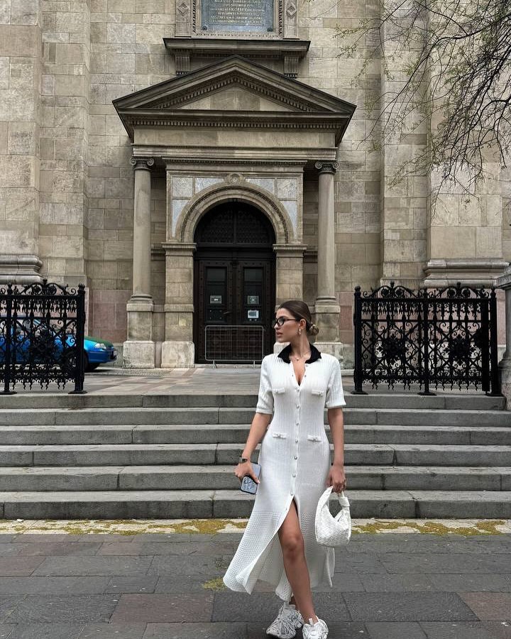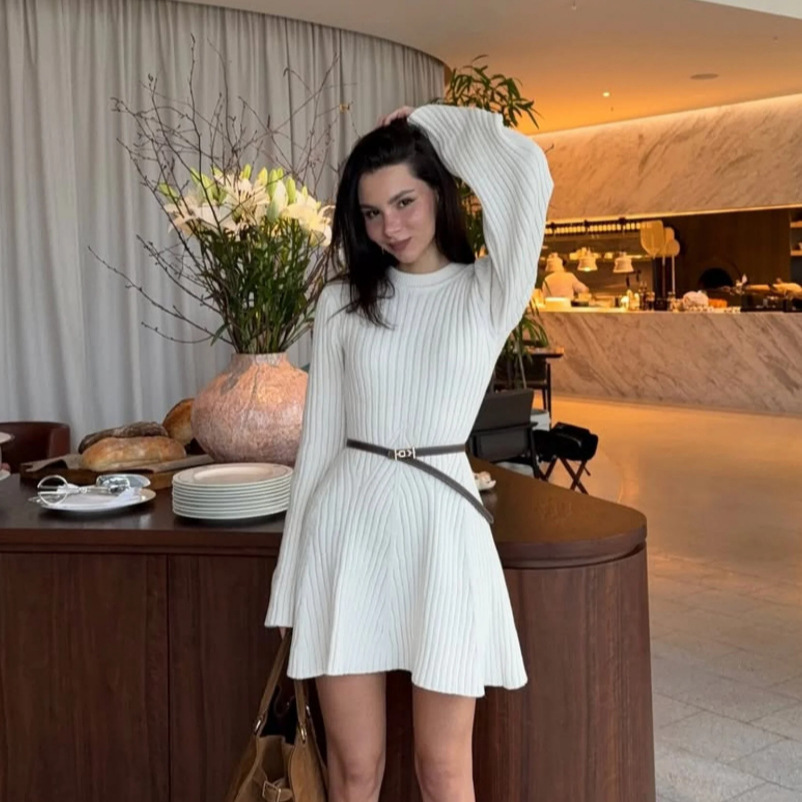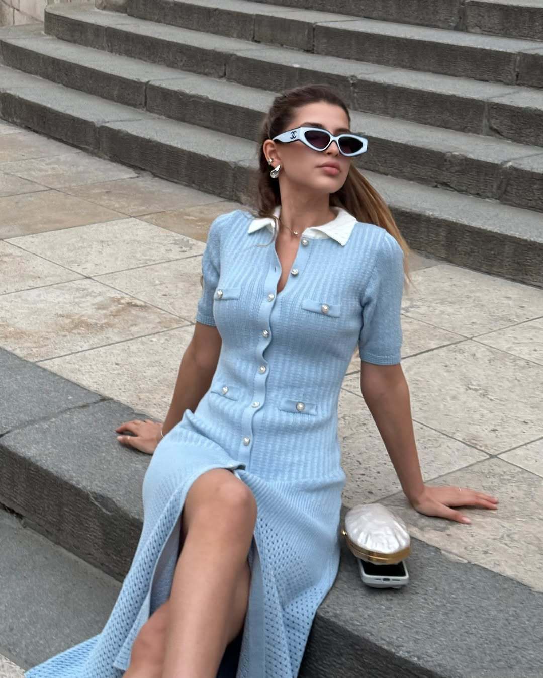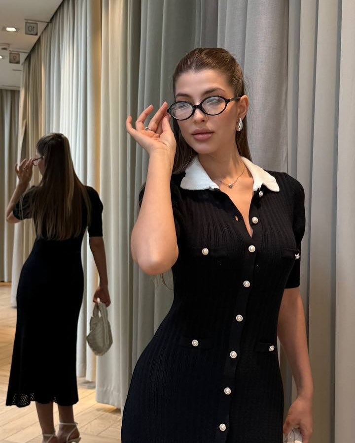 法式单排扣长款V领翻领高腰黄色针织开叉连衣裙撞色娃娃领连衣裙