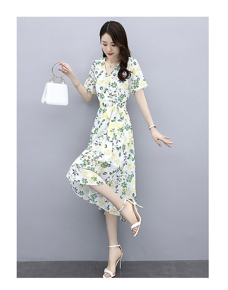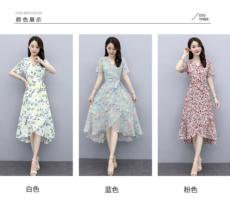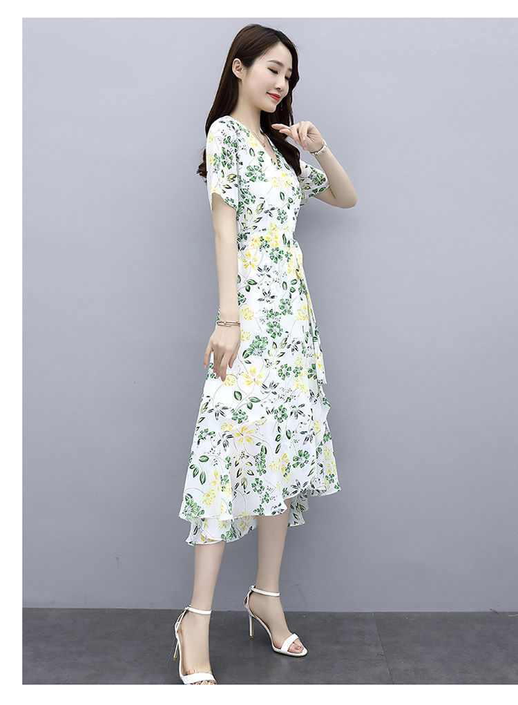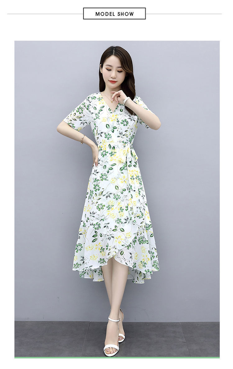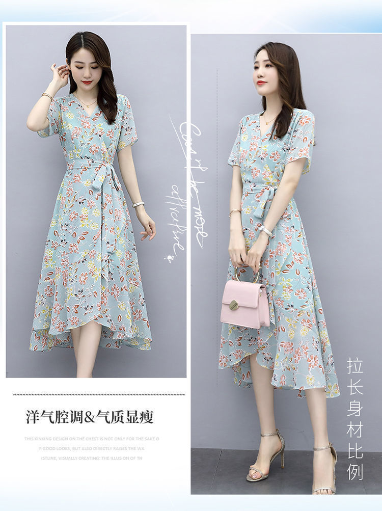 ワンピース女性夏2025新型港味気質修身シフォンプリント中長スカート冷淡風優しいスカート仙