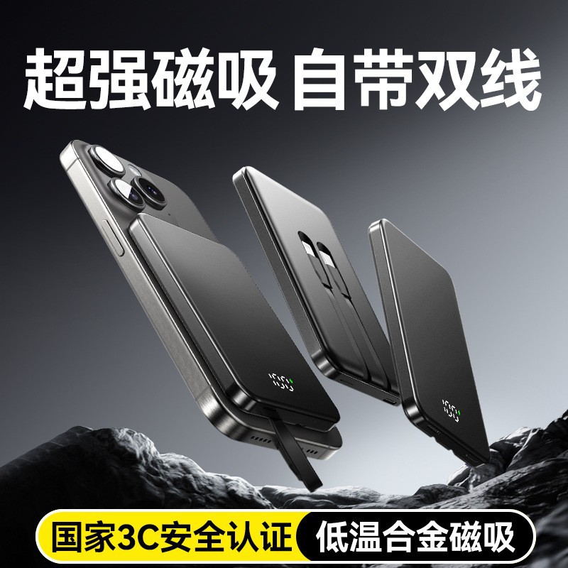 3C認証取得済みの磁気ワイヤレス充電パック、アルミニウム合金製の薄型外部電源、PD急速充電対応、飛行機に持ち込むことも可能