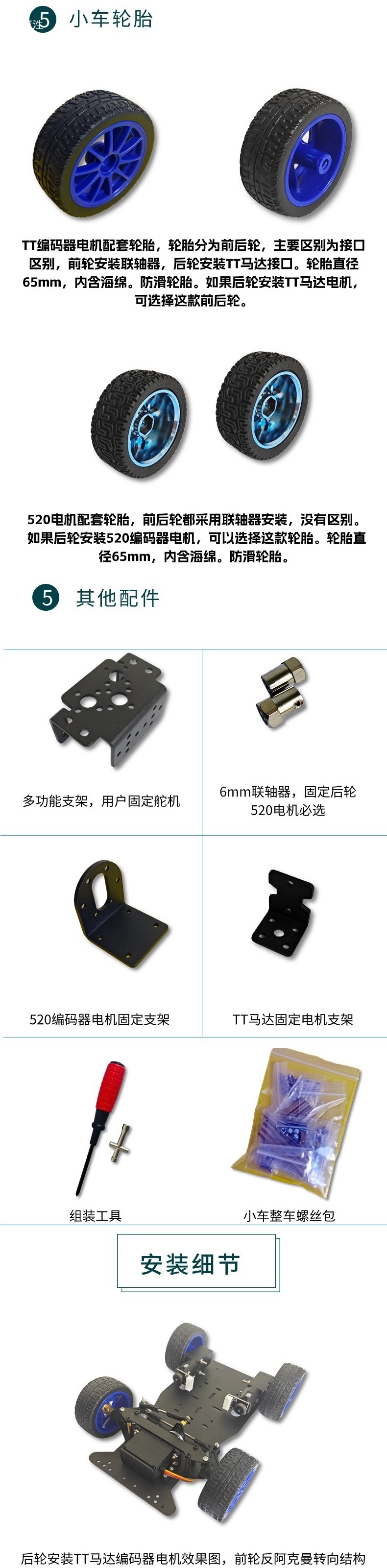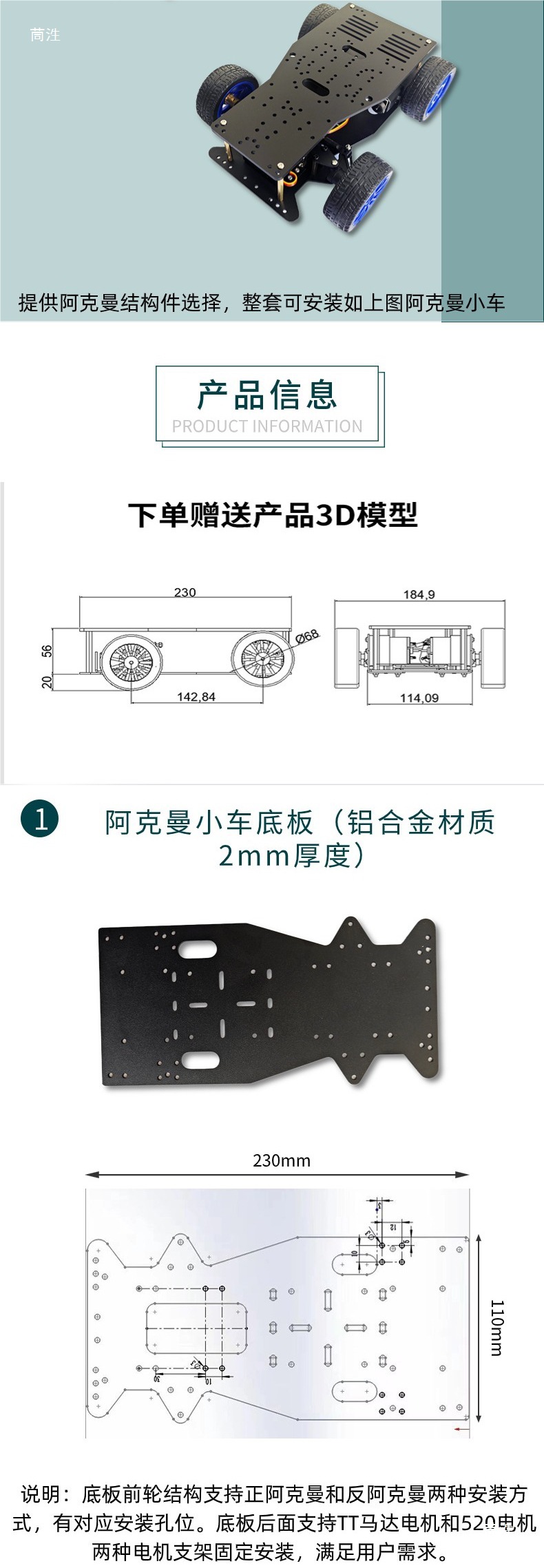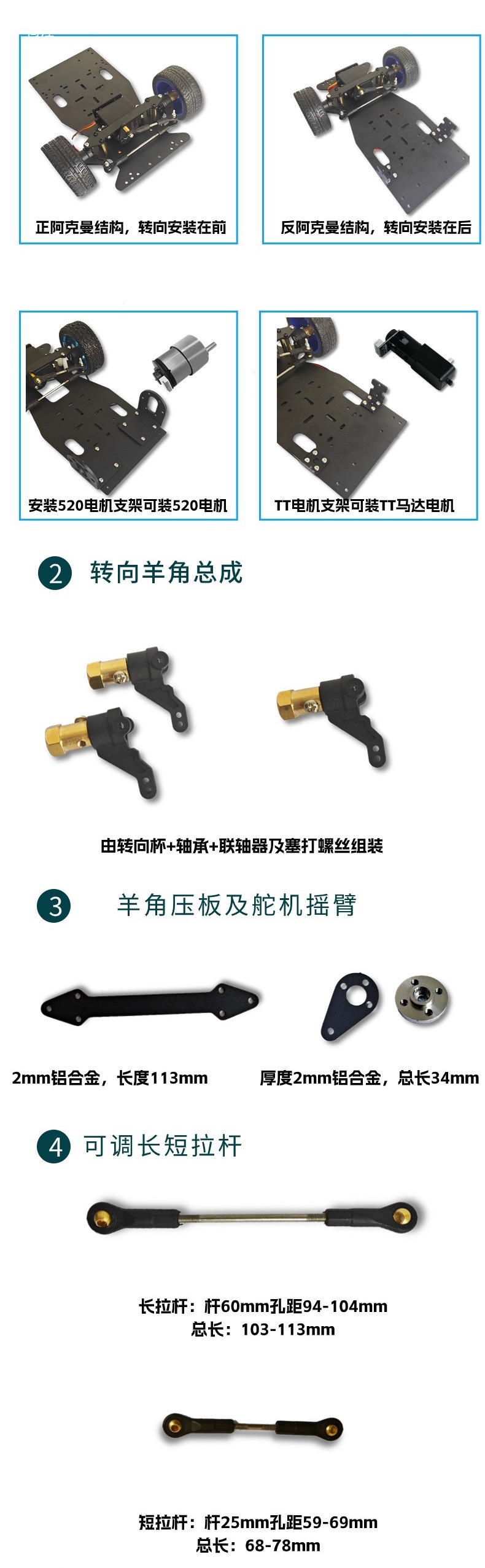 仕様 アルミニウム合金ベースプレート 1 枚,アクリル拡張ボード上層 1枚,ステアリングホーンアセンブリ 1個,ロングプルロッド1本,短いプルロッド1本,羊の角プレッシャープレート 1 枚,1 ステアリングギアロッカーアーム,ステアリングホイール1個,6mmカップリング 2 520後輪モーター取り付け,多機能スタンド1個,組み立てツール1セット,コラムを含むトロリー用の完全なネジセット 1 セット,520モーター固定ブラケット1個,TT 固定モーターブラケット 1 個,TTモーターに適合する前輪1個,TTモーターに適合する後輪1個,520モーターに適合するタイヤ1本,ステアリングギアとモーターを除く、TT バージョンに適したトロリーの構造部品の完全なセット。,ステアリングギアとモーターを除く、520 モーターバージョンに適したトロリーの構造部品の完全なセット 1 セット