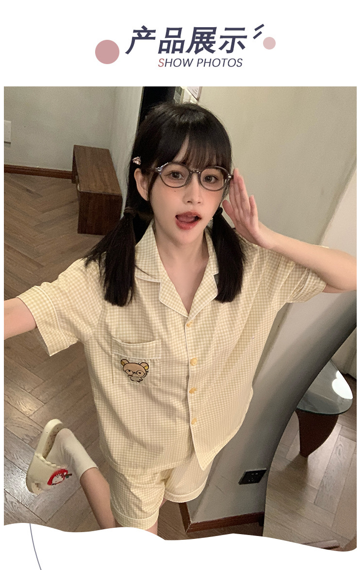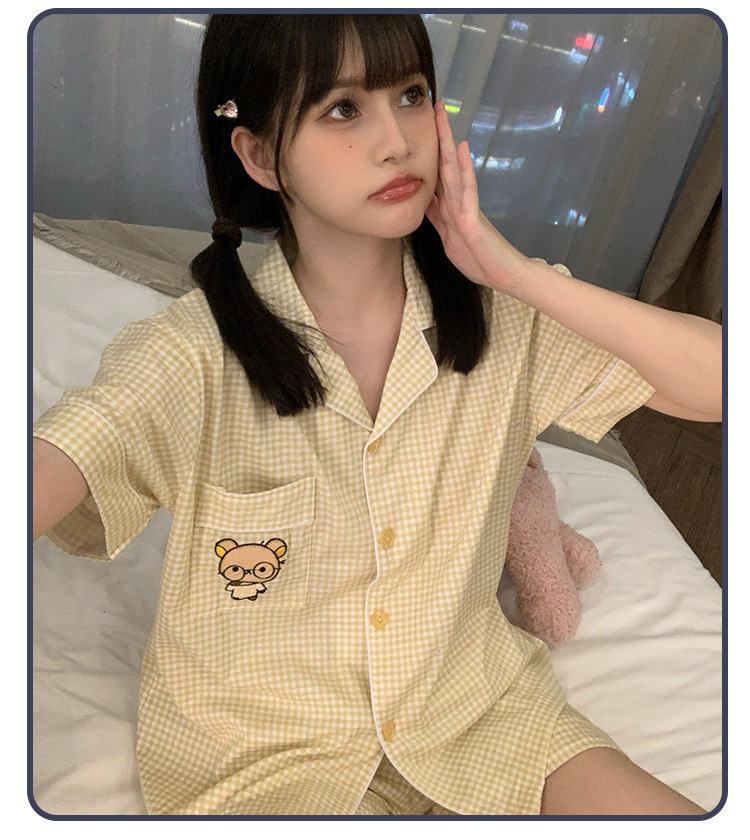日系insパジャマ女性秋冬格子フランネル厚手漫画学生格子カーディガンホームウェアセット