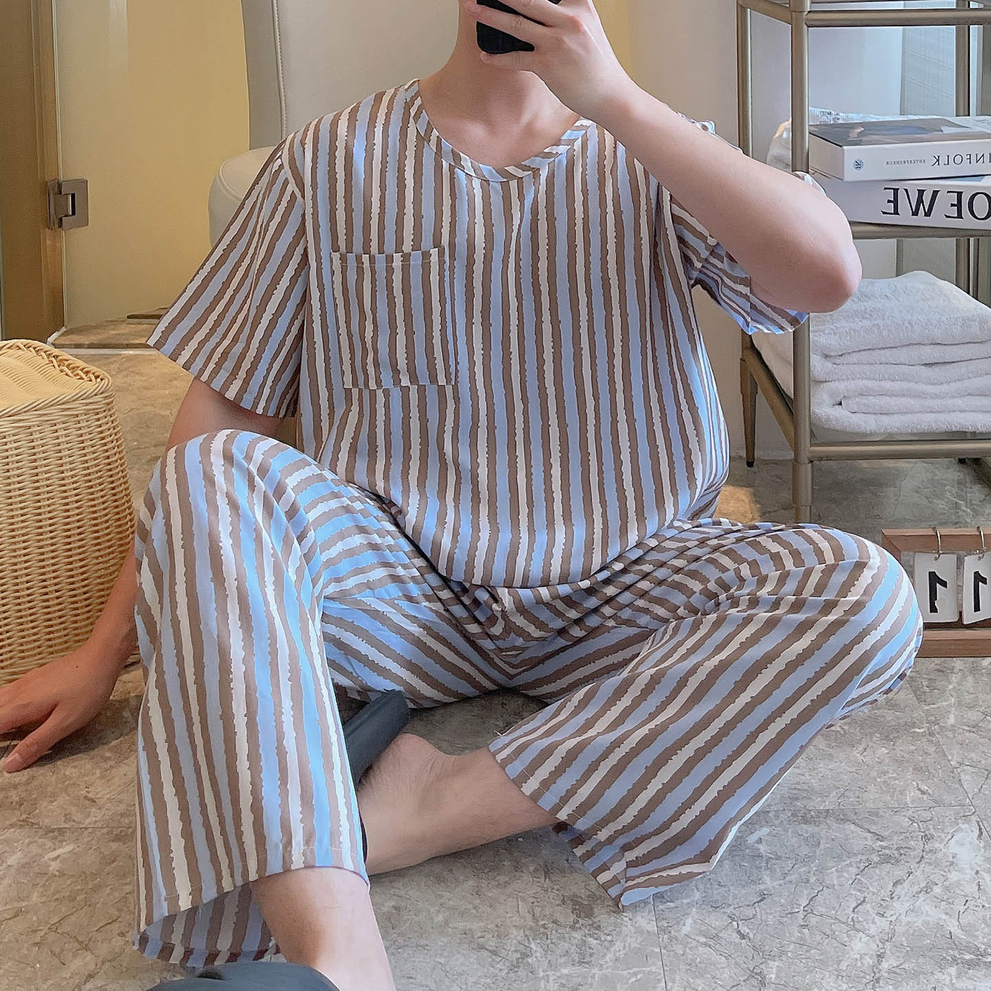 2025 新しいメンズパジャマ夏薄い綿シルクルーズ半袖ズボンホームウェアセットカジュアルスーツ
