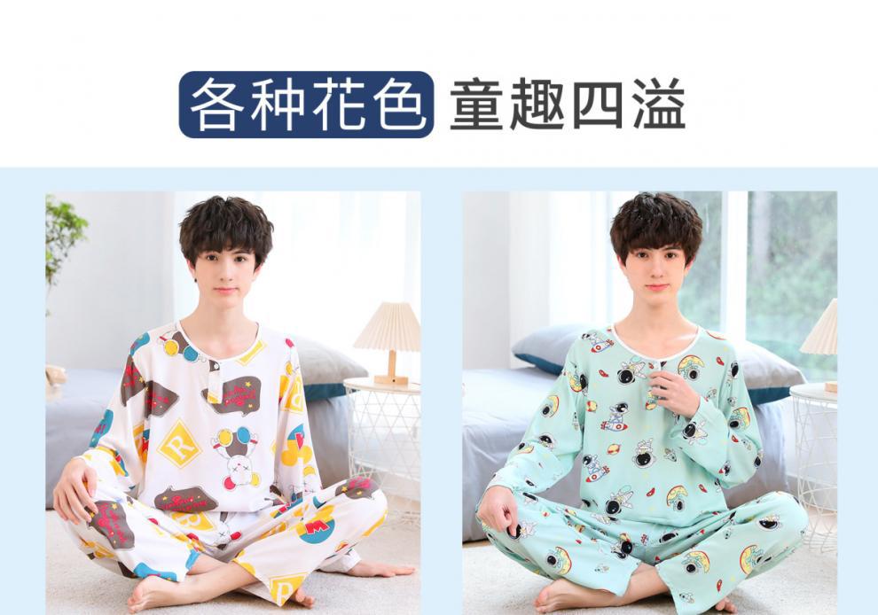 メンズパジャマ綿シルク長袖薄手綿シルクティーンエイジャーカートゥーンホームウェアセット大きいサイズ外でも着用可能通気性あり