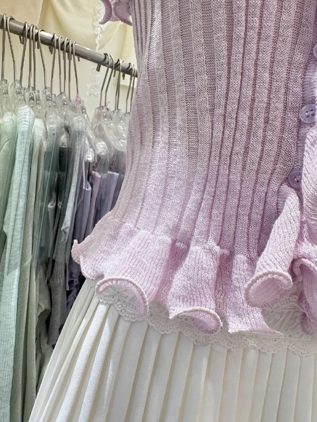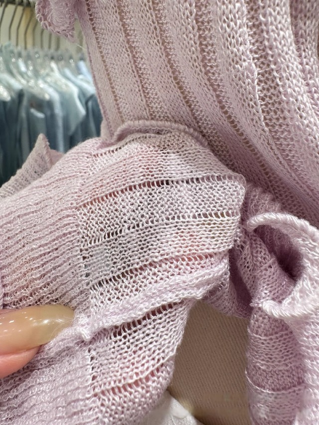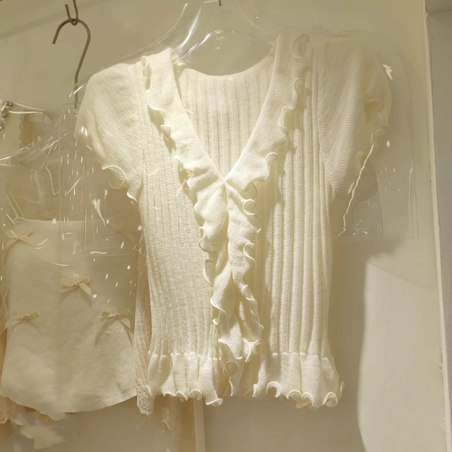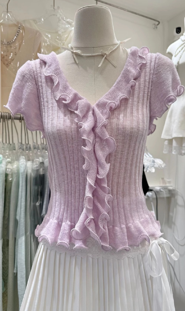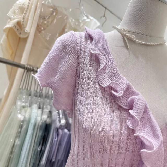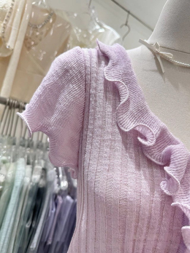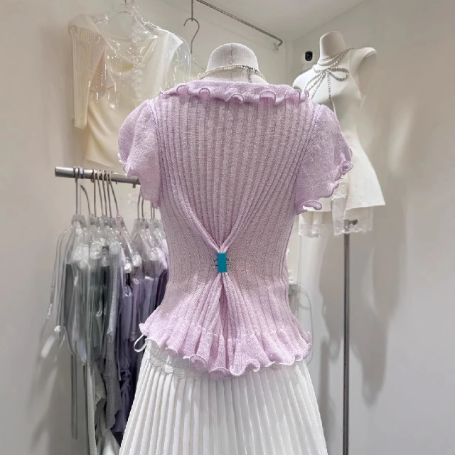 2025年新作夏ニット半袖デザイン、スリムでフリル、ユニークで超見栄えの良いシングルトップ、美しい
