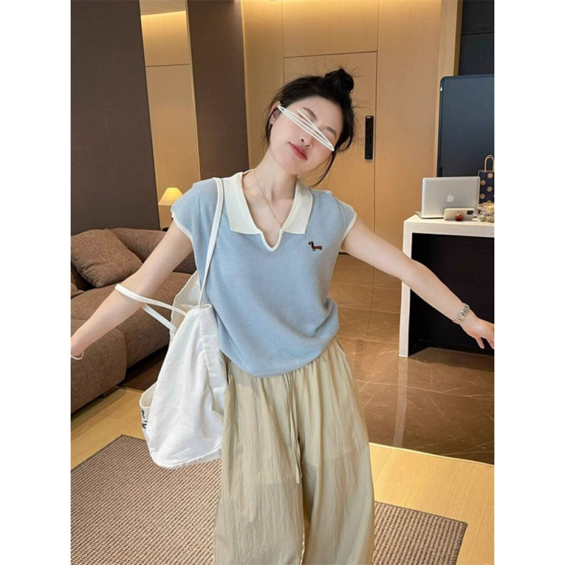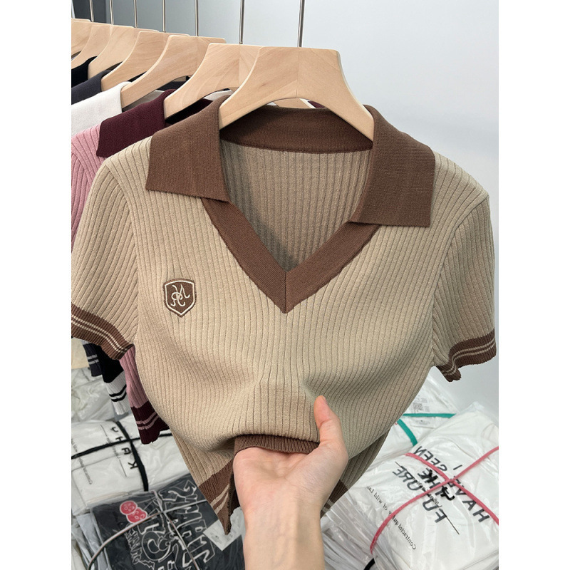 ブルーアイスシルクカラーシャツレディース夏右肩コントラストカラーステッチ刺繍半袖セーターカラーショートトップ