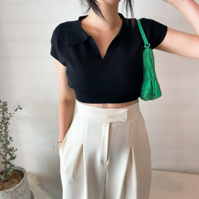韓国の夏のシンプルなラペルスリムフィットカジュアル多用途ショートへそ漏れニットセーター女性用