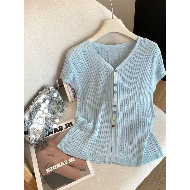 広州十三行人気の女性のヨーロッパスタイルの襟カーディガン半袖アイスシルク薄手のトップ夏無地セーター