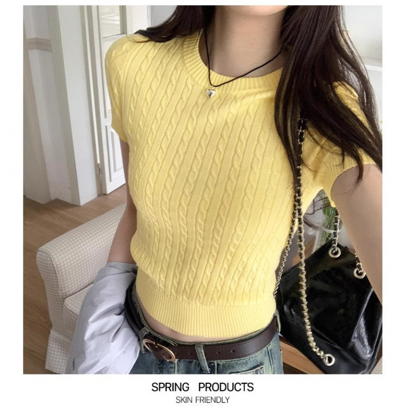 デザインツイストミルクイエロー半袖セーターレディース2025春夏新作ハイウエストタイトファッションシャツトップ