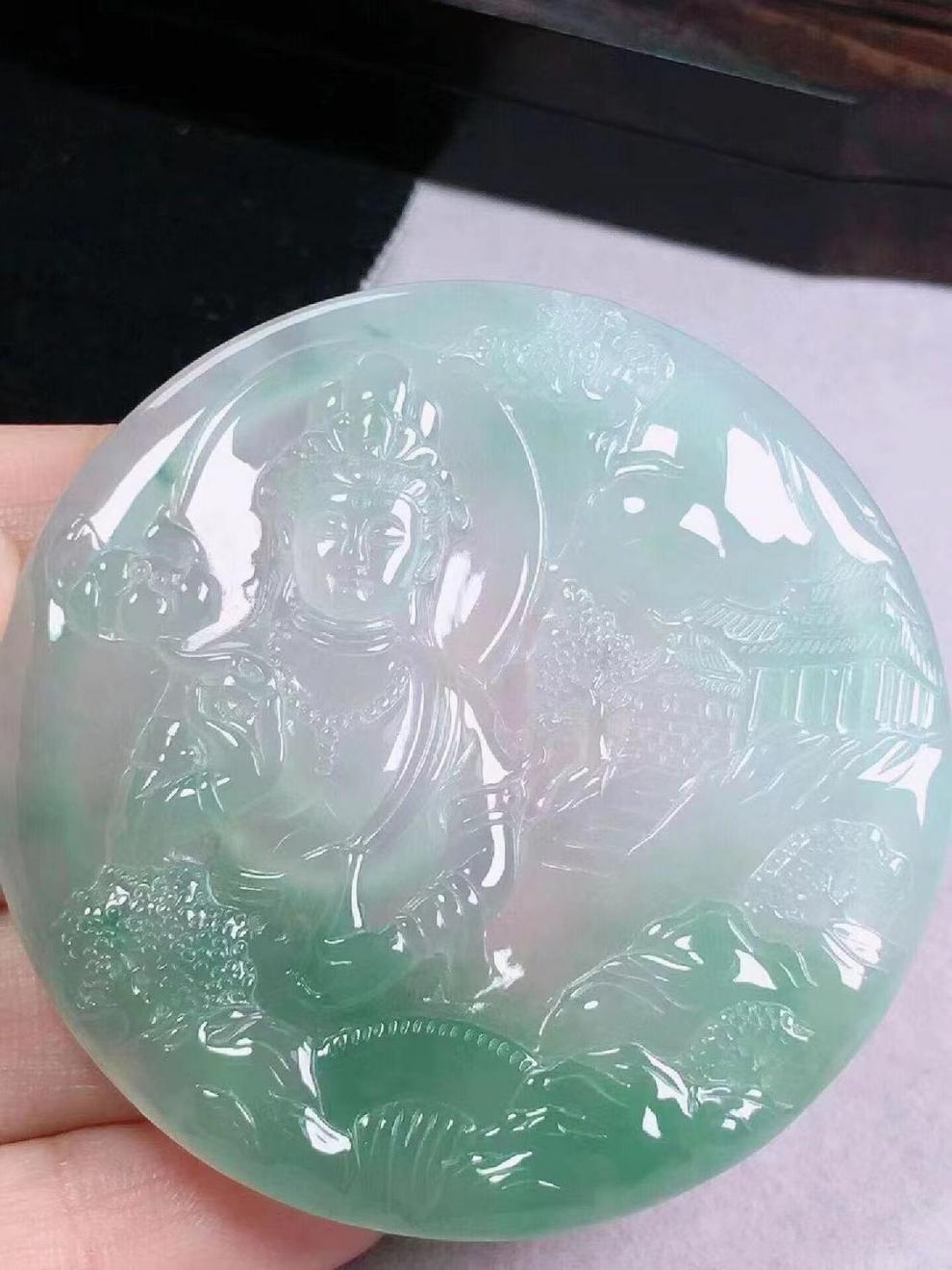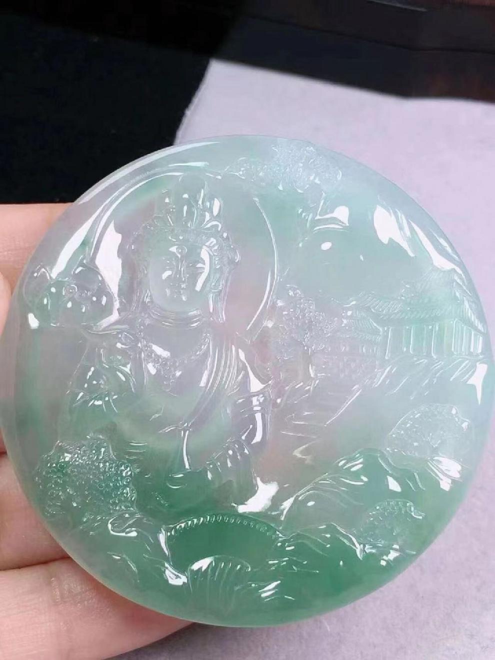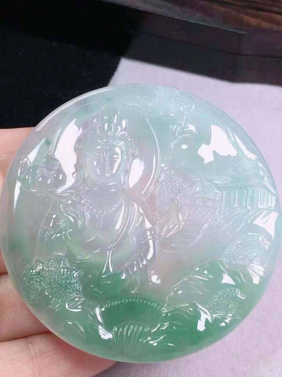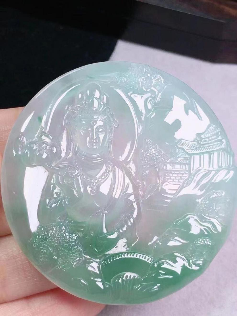 ミャンマー老坑翡翠翡翠ハイアイス種類フローティンググリーン普度世界風景観音ラウンドプレート翡翠ペンダントメンズ翡翠ペンダント