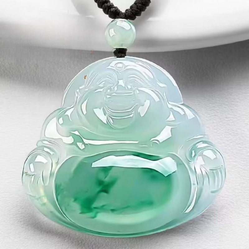 周6稫缅甸翡翠(A货)弥勒佛吊坠女阳绿飘花挂绳佛公玉石项坠带证书