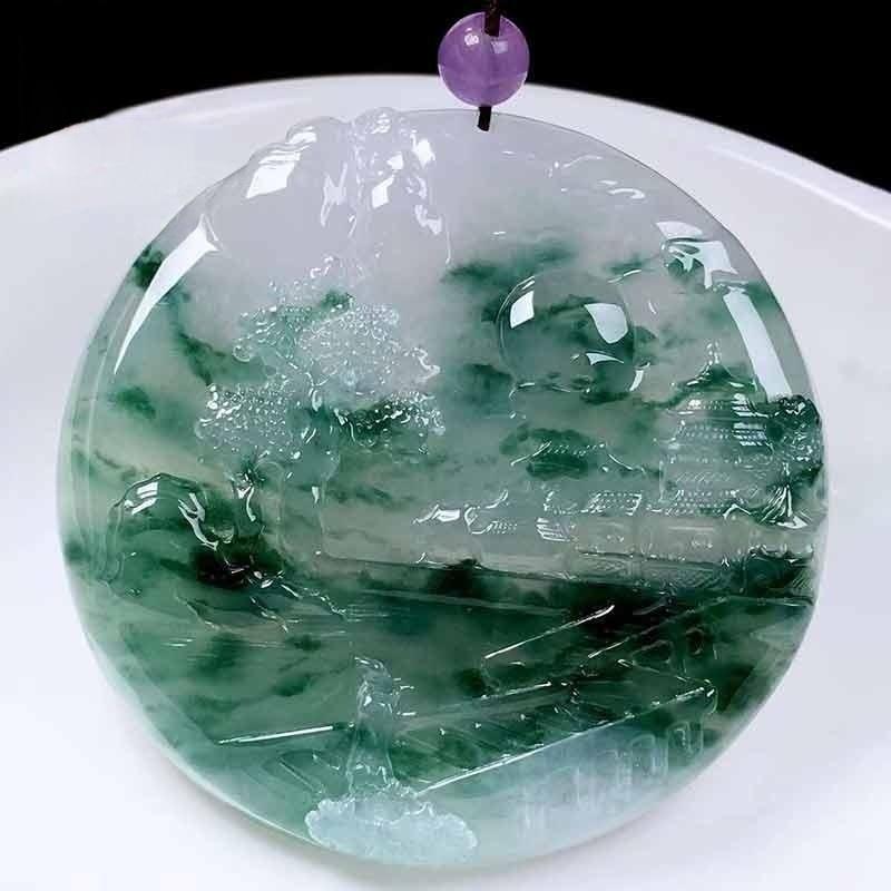 翡翠飘花山水人物圆牌缅甸老坑玉石雕刻冰种吊坠挂件男